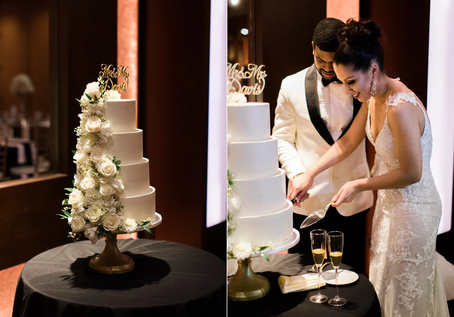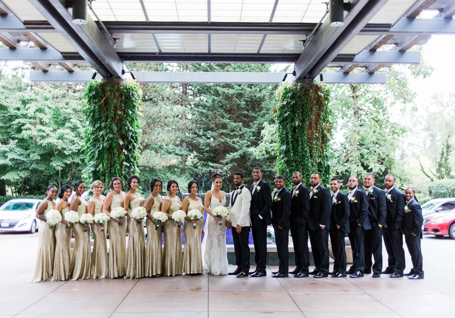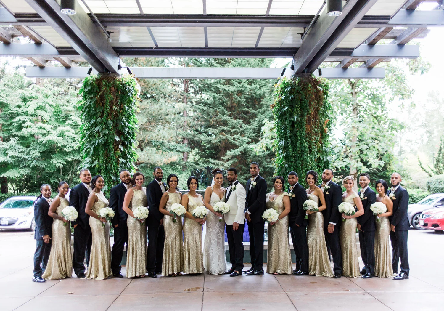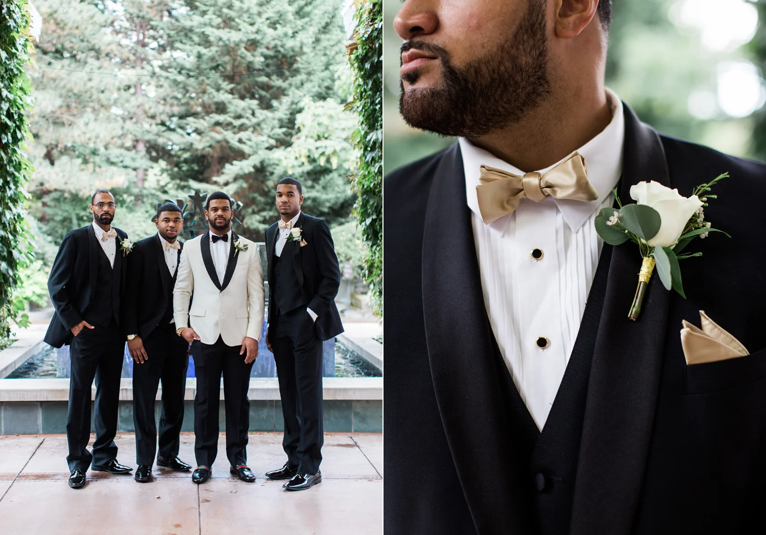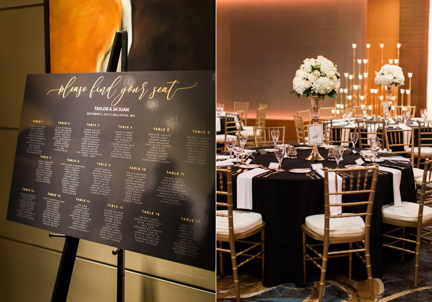 There are elegant weddings and then there are masterfully planned and completely stunning black tie affairs that are memorable beyond all belief. I am so happy to have been Taylor & Ja’Juan’s wedding photographer! When I first met with Taylor she told me of her vision to have a black and gold wedding, very refined, simple but very classic. Her vision came to life in stunning fashion at their wedding held at The Bellevue Club in Bellevue, WA. Taylor’s beautiful lace dress was a perfect compliment to her groom’s creme jacket, along with gold bow ties on all the groomsmen to match the bridesmaids’ dresses. Everything throughout the entire wedding day was so beautiful.
