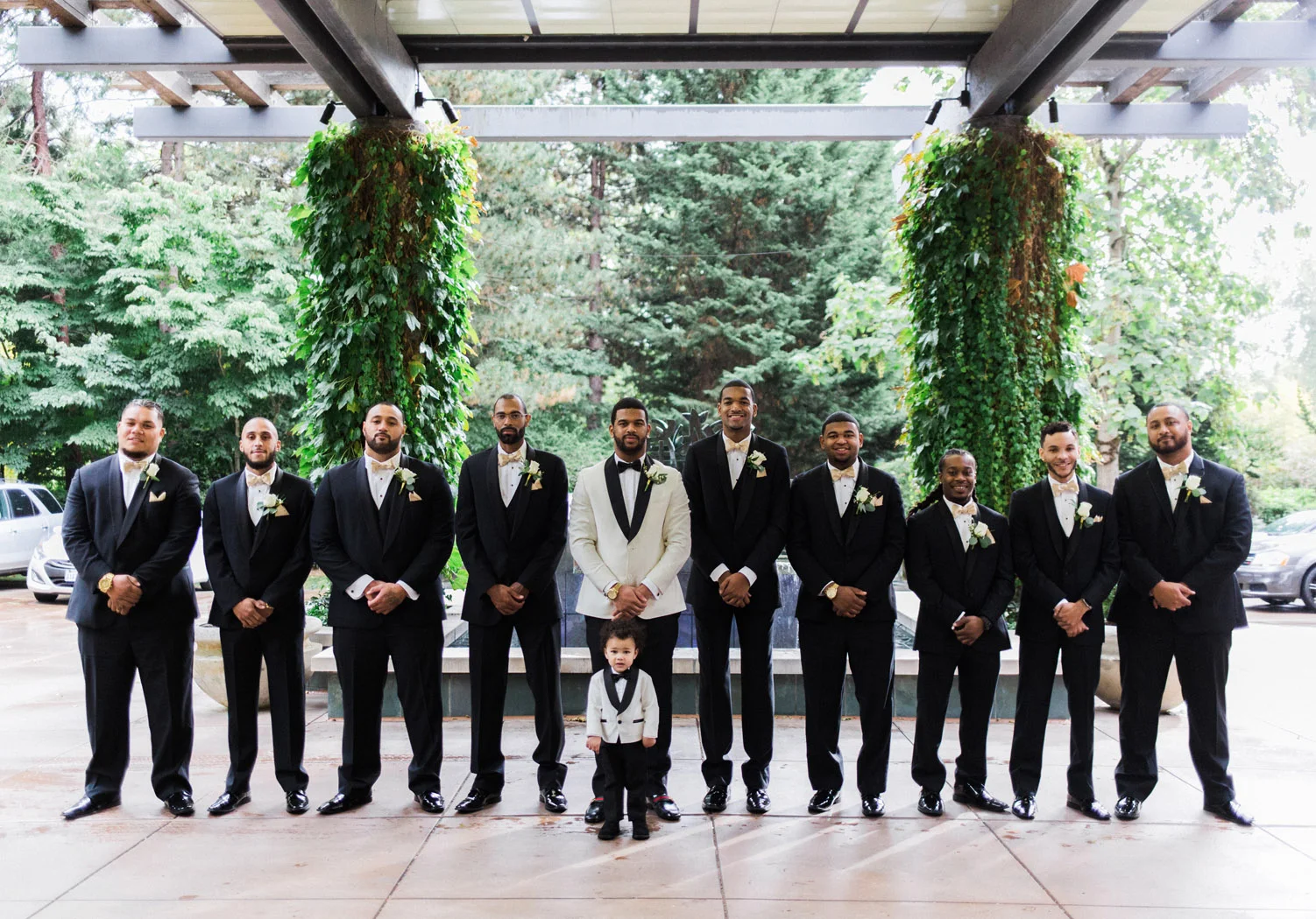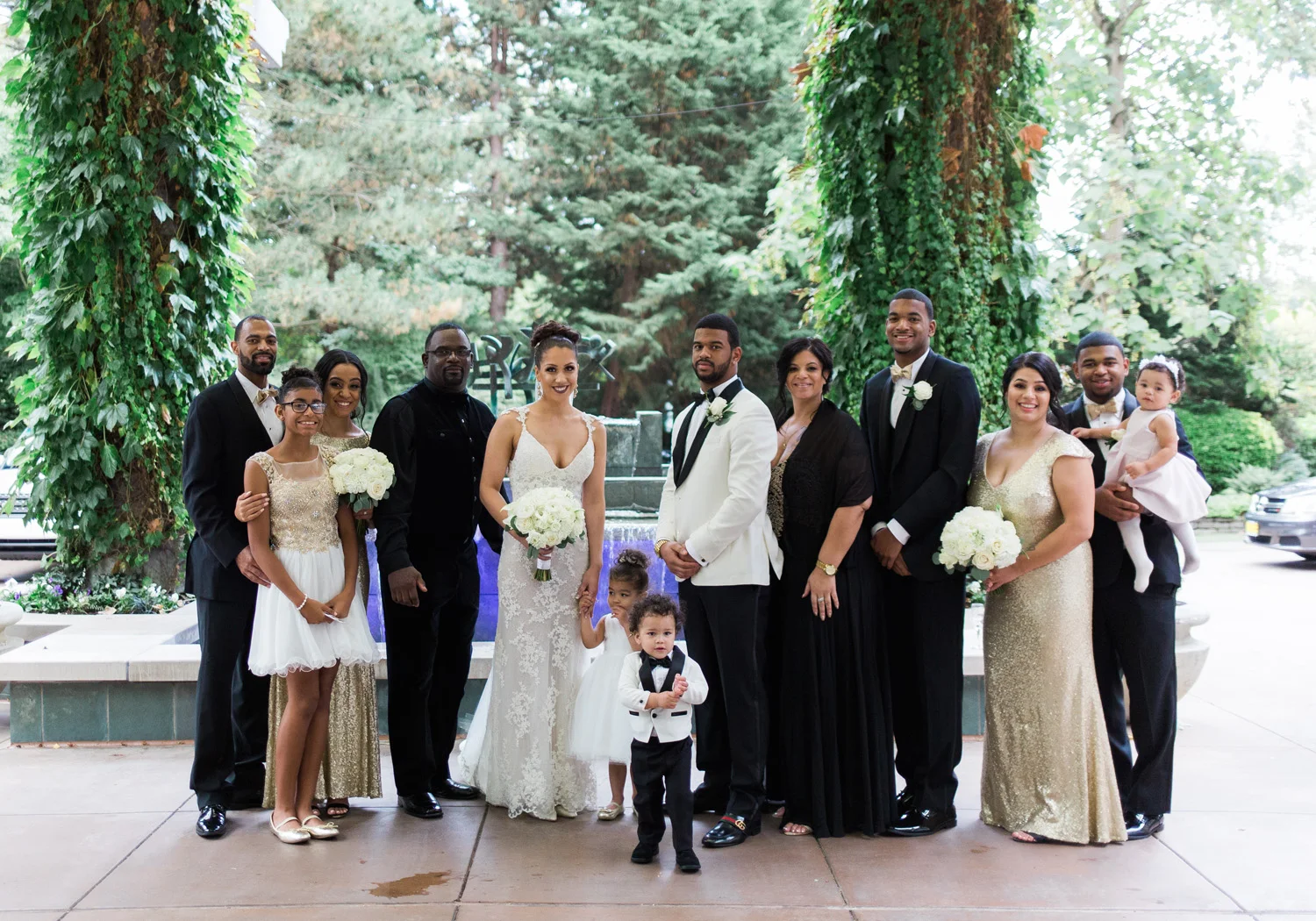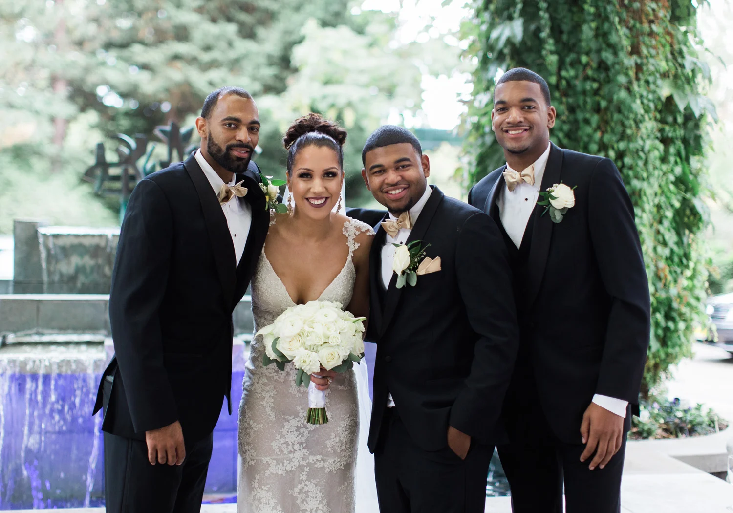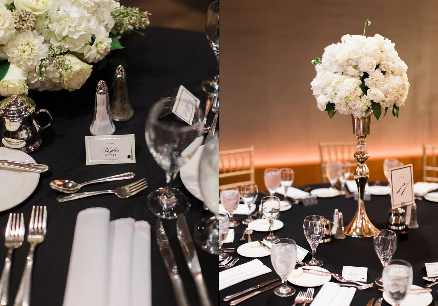 There are elegant weddings and then there are masterfully planned and completely stunning black tie affairs that are memorable beyond all belief. I am so happy to have been Taylor & Ja’Juan’s wedding photographer! When I first met with Taylor she told me of her vision to have a black and gold wedding, very refined, simple but very classic. Her vision came to life in stunning fashion at their wedding held at The Bellevue Club in Bellevue, WA. Taylor’s beautiful lace dress was a perfect compliment to her groom’s creme jacket, along with gold bow ties on all the groomsmen to match the bridesmaids’ dresses. Everything throughout the entire wedding day was so beautiful.