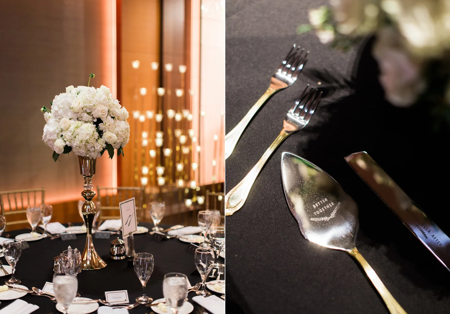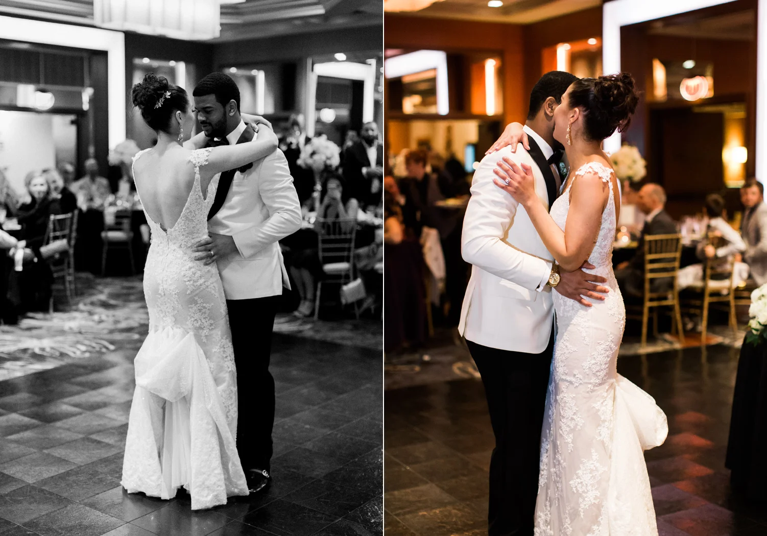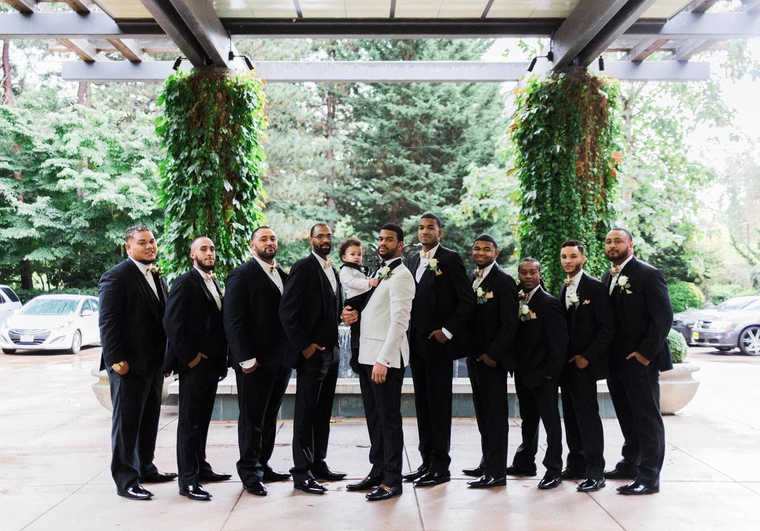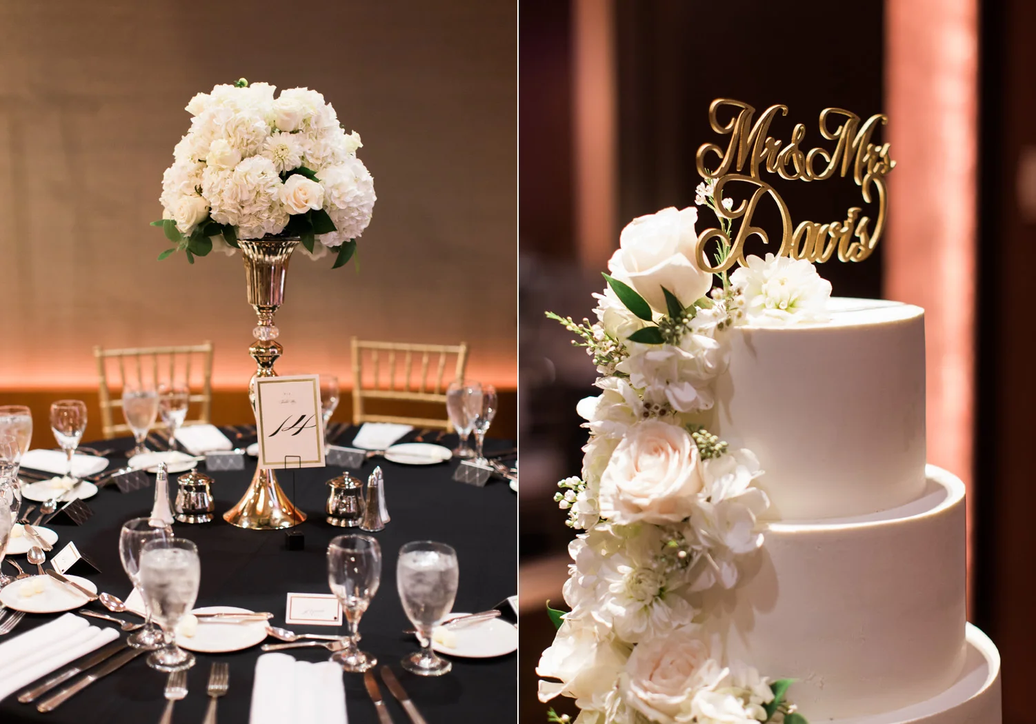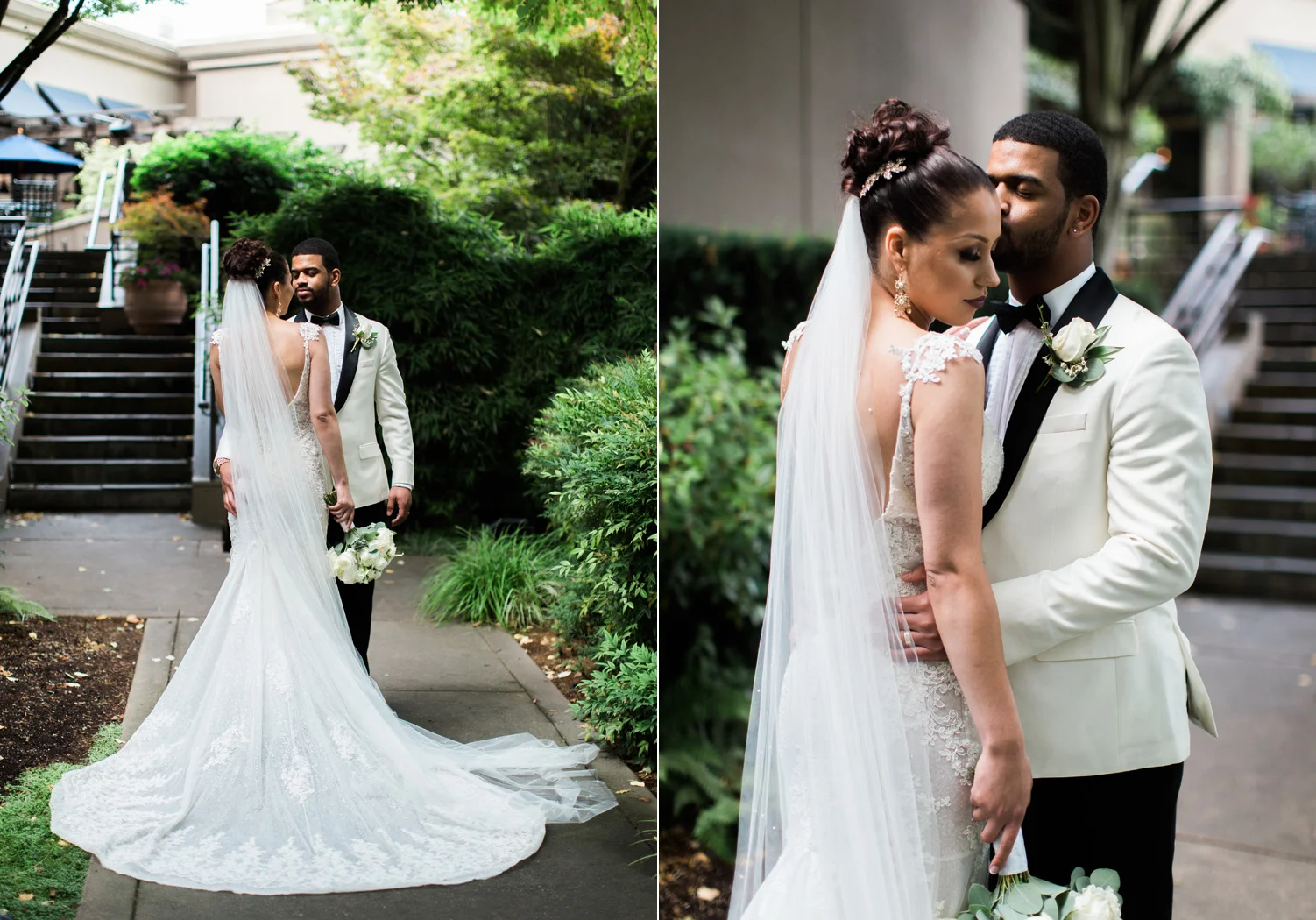 There are elegant weddings and then there are masterfully planned and completely stunning black tie affairs that are memorable beyond all belief. I am so happy to have been Taylor & Ja’Juan’s wedding photographer! When I first met with Taylor she told me of her vision to have a black and gold wedding, very refined, simple but very classic. Her vision came to life in stunning fashion at their wedding held at The Bellevue Club in Bellevue, WA. Taylor’s beautiful lace dress was a perfect compliment to her groom’s creme jacket, along with gold bow ties on all the groomsmen to match the bridesmaids’ dresses. Everything throughout the entire wedding day was so beautiful.