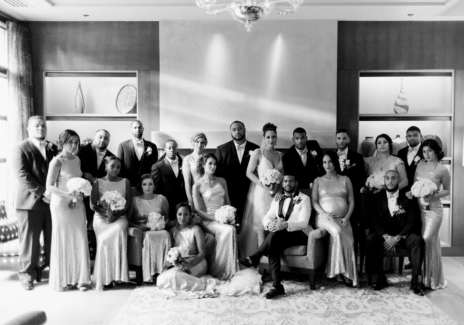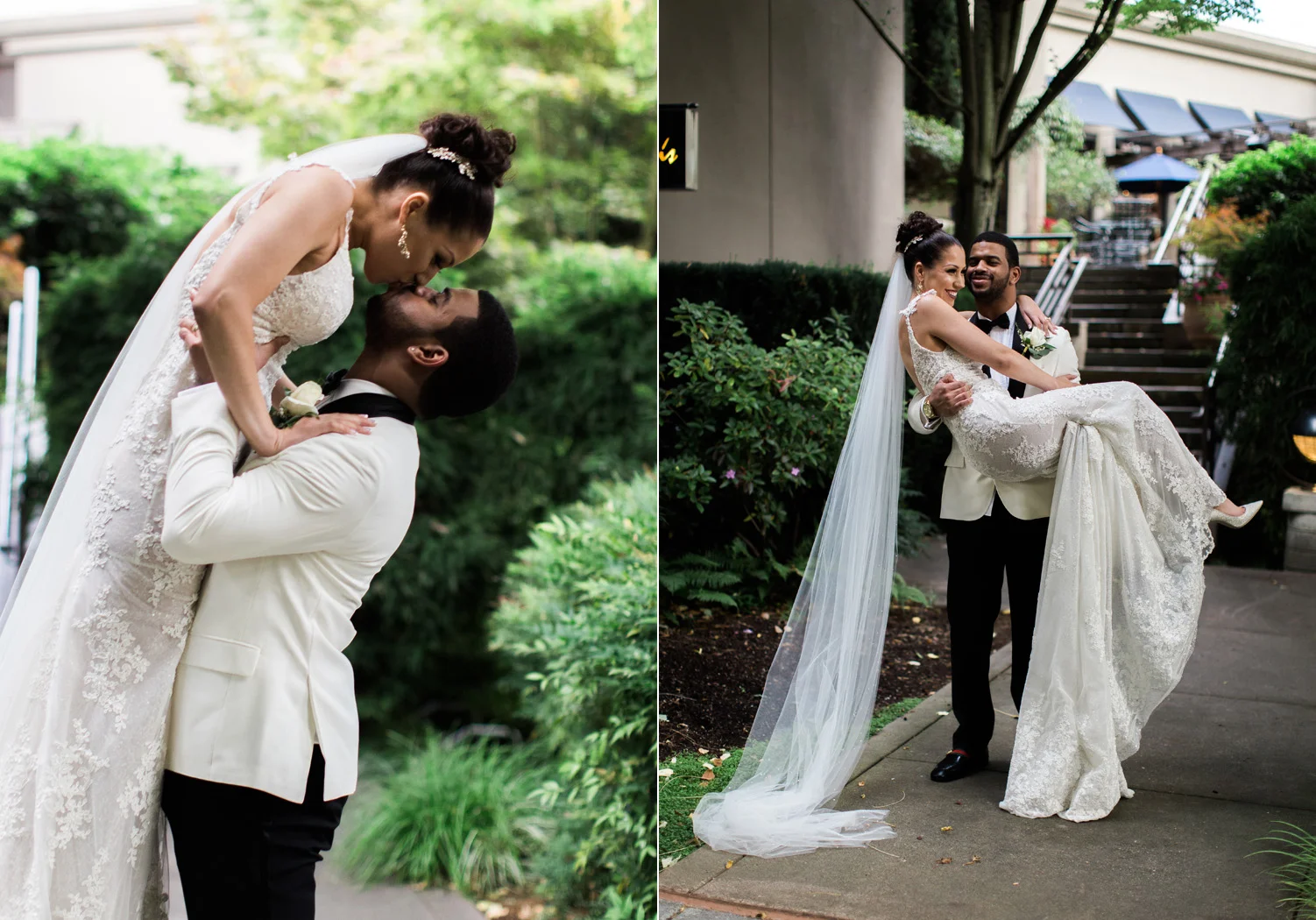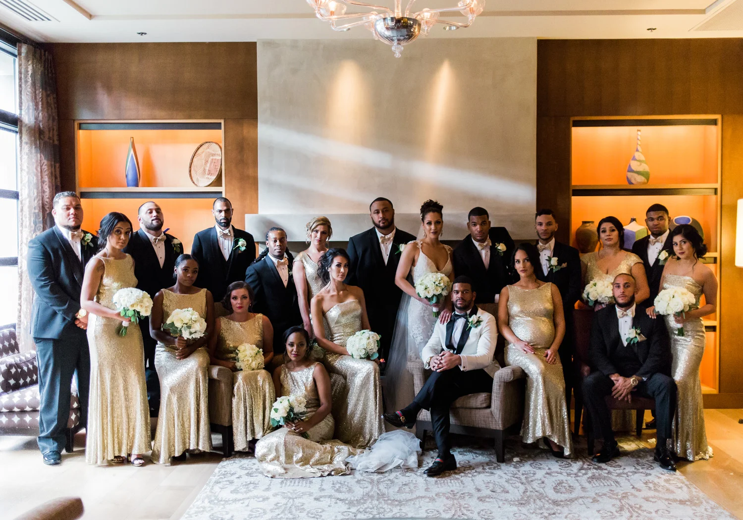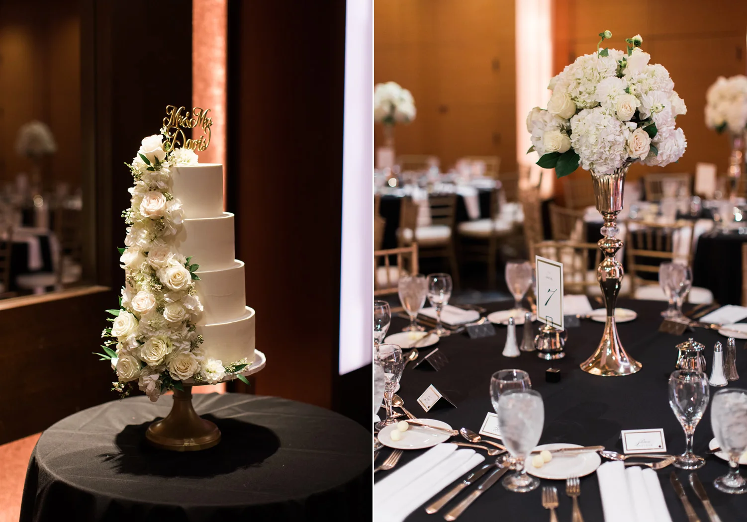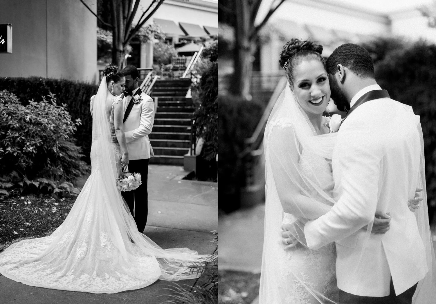 There are elegant weddings and then there are masterfully planned and completely stunning black tie affairs that are memorable beyond all belief. I am so happy to have been Taylor & Ja’Juan’s wedding photographer! When I first met with Taylor she told me of her vision to have a black and gold wedding, very refined, simple but very classic. Her vision came to life in stunning fashion at their wedding held at The Bellevue Club in Bellevue, WA. Taylor’s beautiful lace dress was a perfect compliment to her groom’s creme jacket, along with gold bow ties on all the groomsmen to match the bridesmaids’ dresses. Everything throughout the entire wedding day was so beautiful.