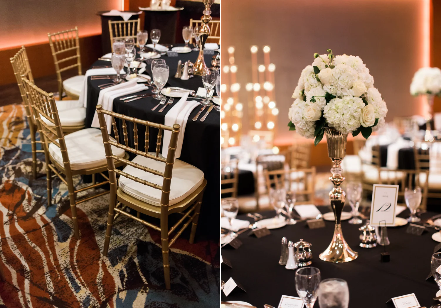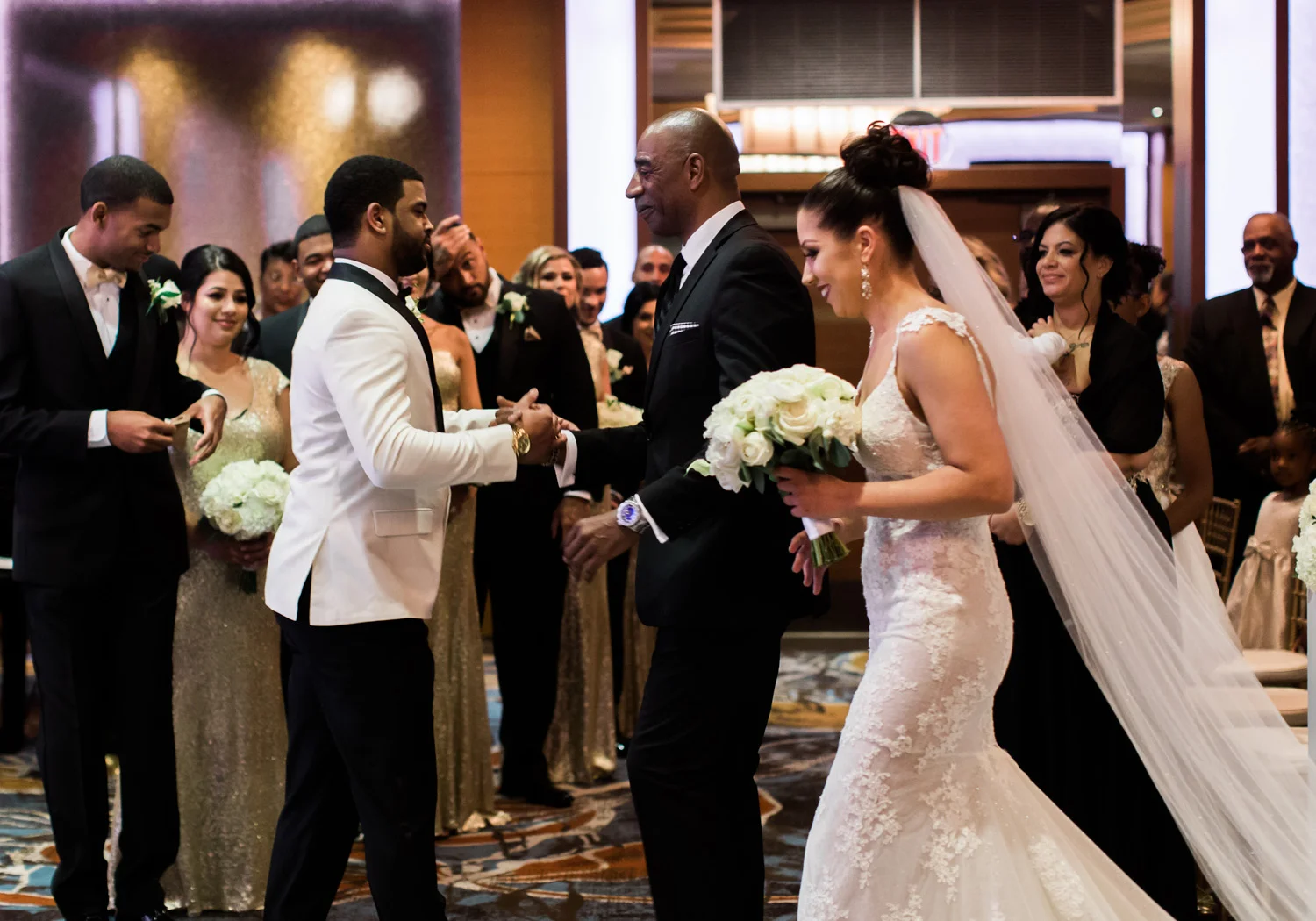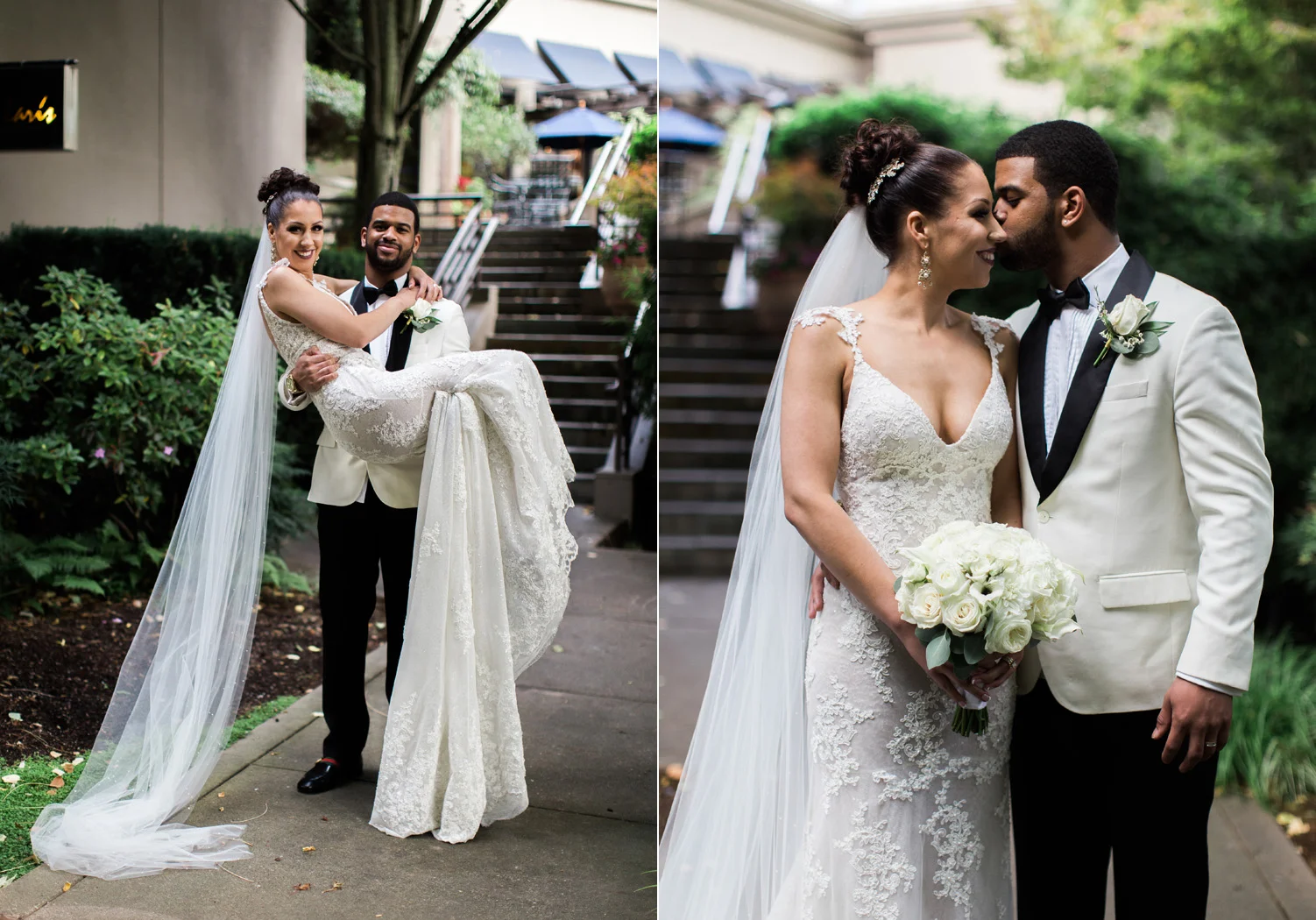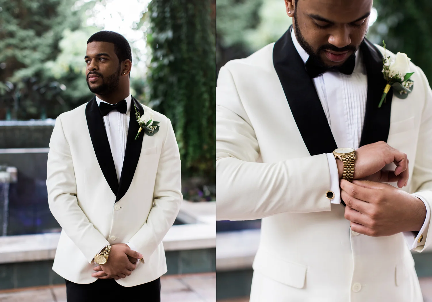 There are elegant weddings and then there are masterfully planned and completely stunning black tie affairs that are memorable beyond all belief. I am so happy to have been Taylor & Ja’Juan’s wedding photographer! When I first met with Taylor she told me of her vision to have a black and gold wedding, very refined, simple but very classic. Her vision came to life in stunning fashion at their wedding held at The Bellevue Club in Bellevue, WA. Taylor’s beautiful lace dress was a perfect compliment to her groom’s creme jacket, along with gold bow ties on all the groomsmen to match the bridesmaids’ dresses. Everything throughout the entire wedding day was so beautiful.