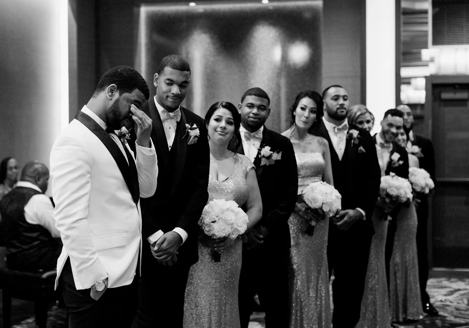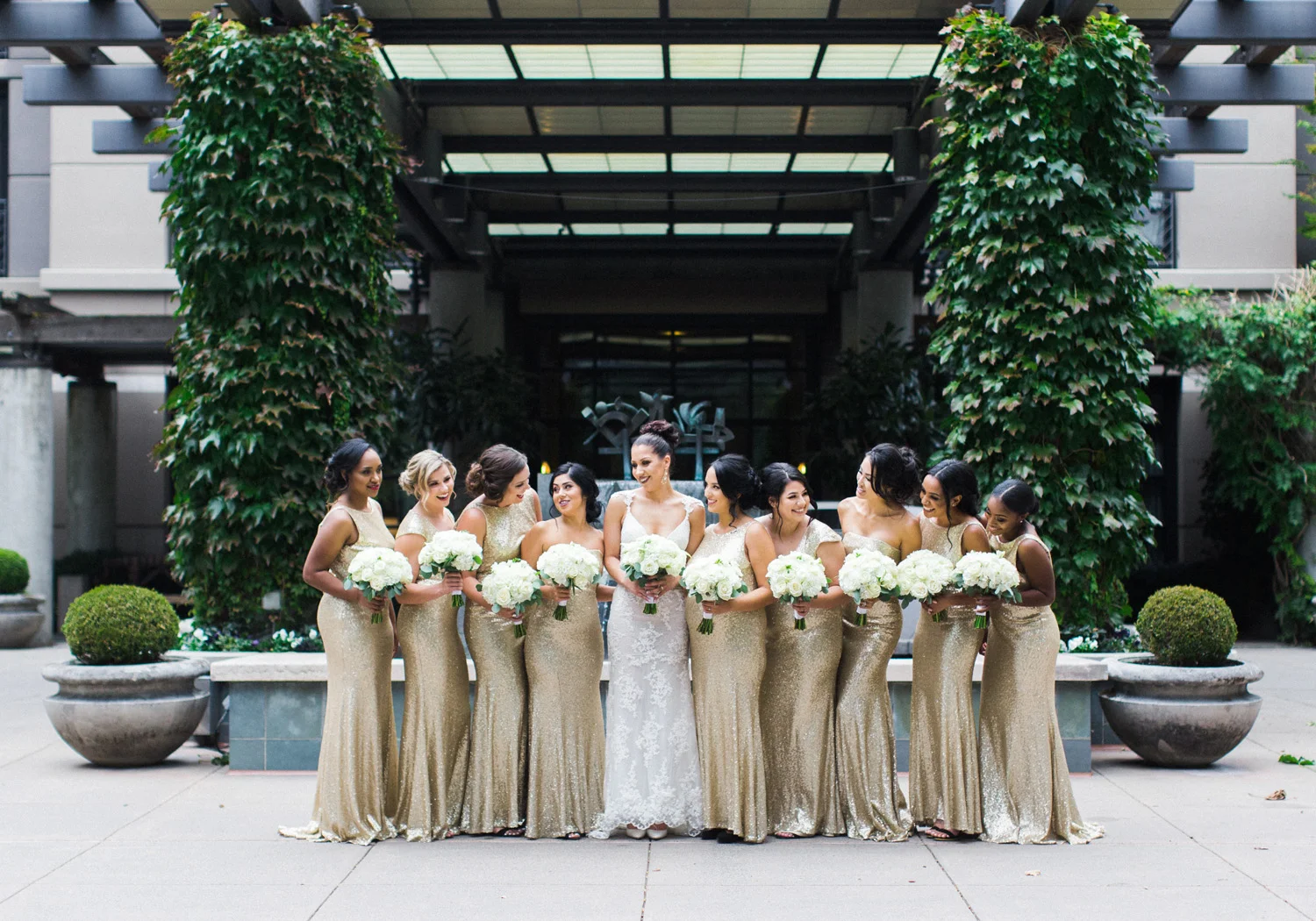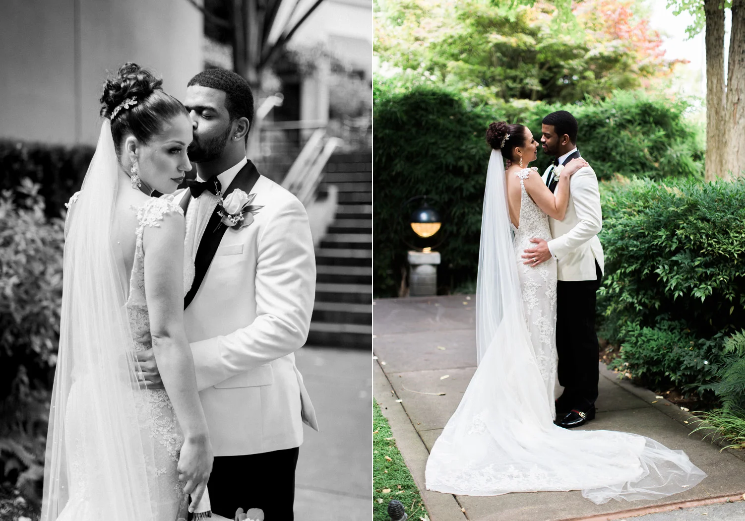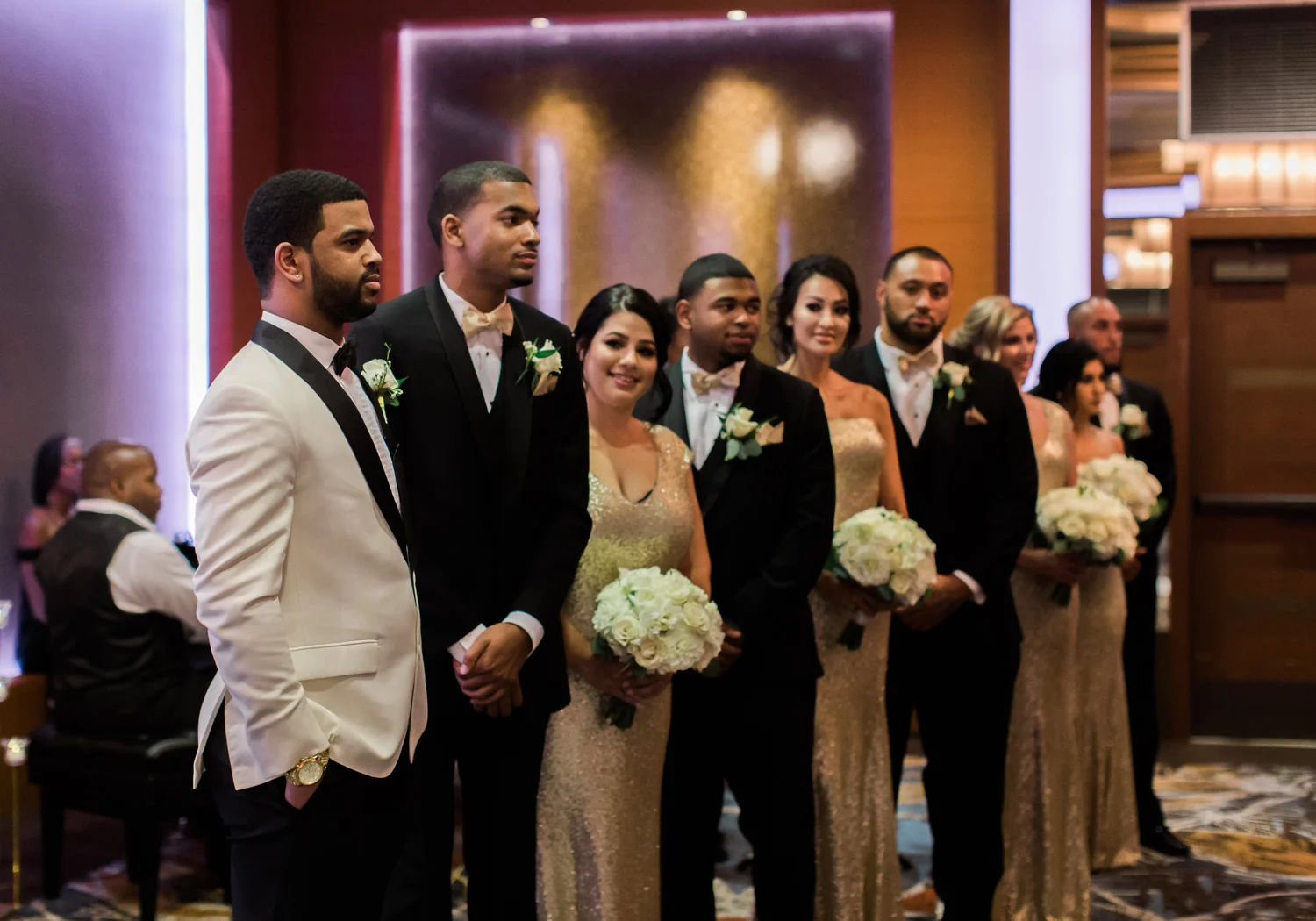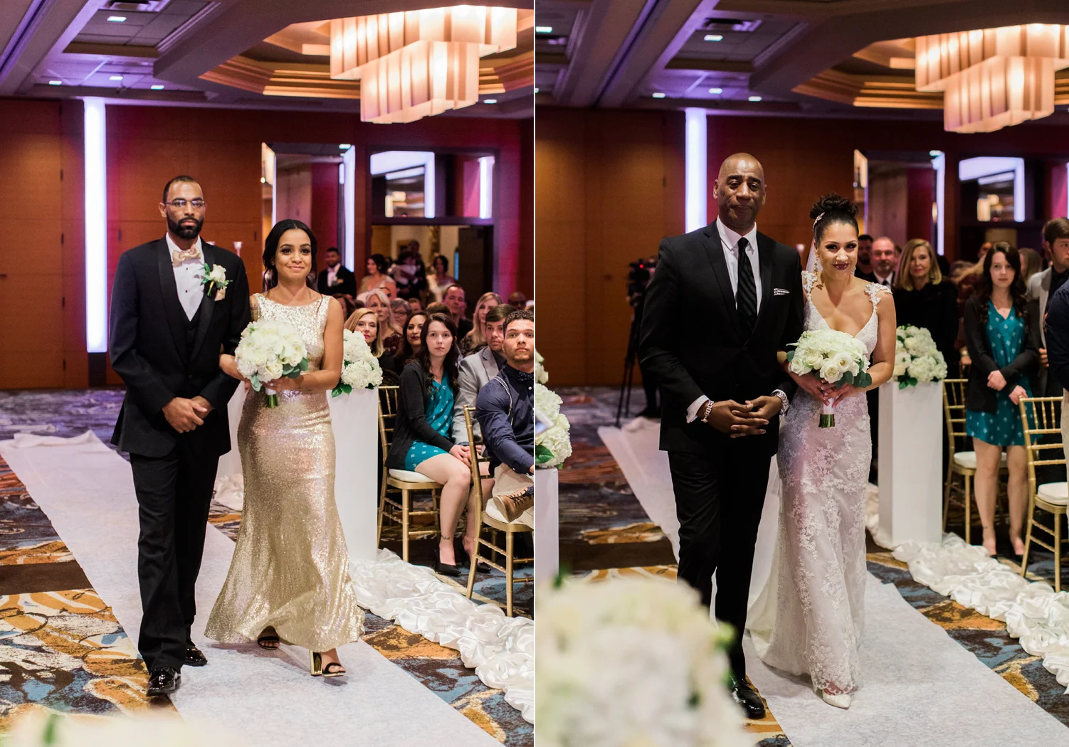 There are elegant weddings and then there are masterfully planned and completely stunning black tie affairs that are memorable beyond all belief. I am so happy to have been Taylor & Ja’Juan’s wedding photographer! When I first met with Taylor she told me of her vision to have a black and gold wedding, very refined, simple but very classic. Her vision came to life in stunning fashion at their wedding held at The Bellevue Club in Bellevue, WA. Taylor’s beautiful lace dress was a perfect compliment to her groom’s creme jacket, along with gold bow ties on all the groomsmen to match the bridesmaids’ dresses. Everything throughout the entire wedding day was so beautiful.
