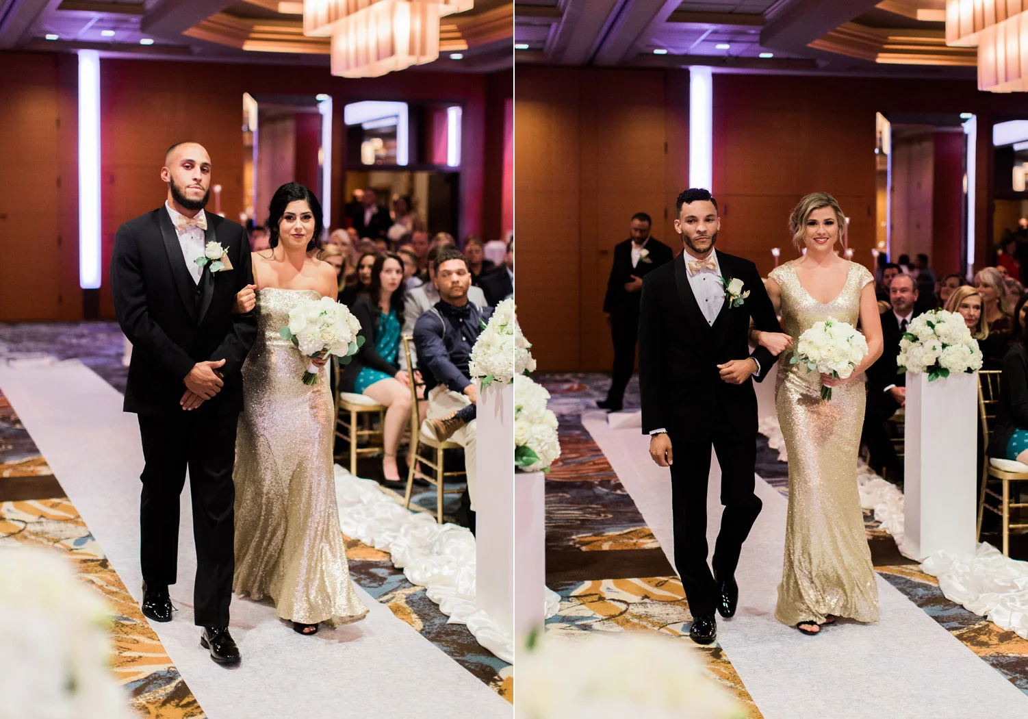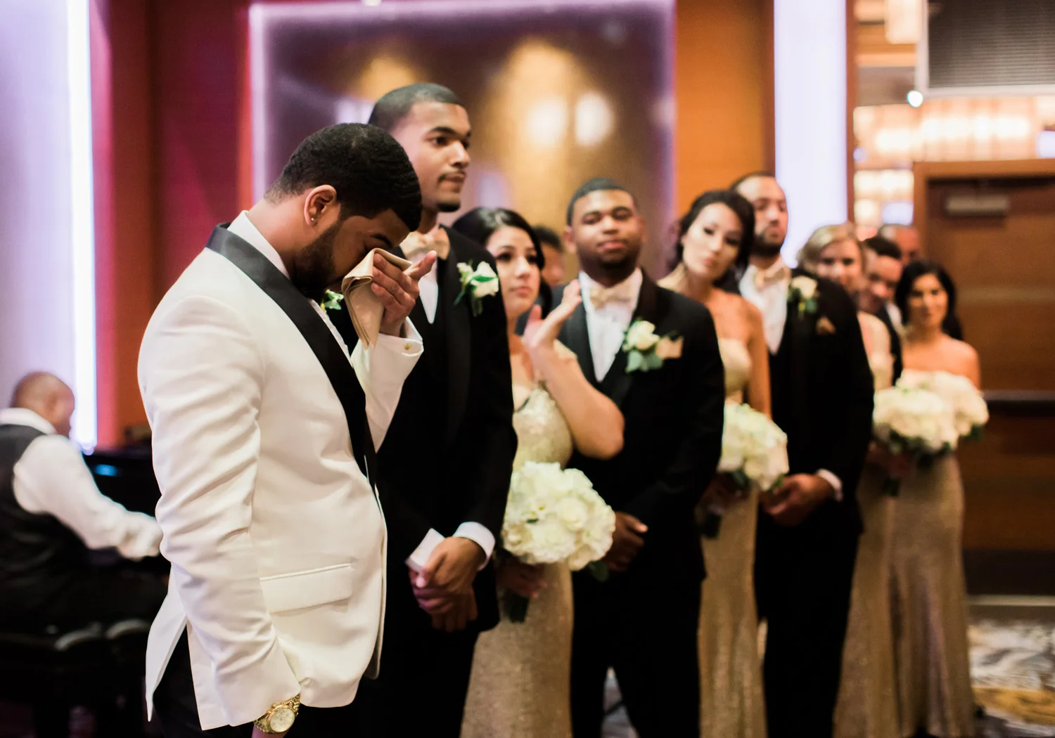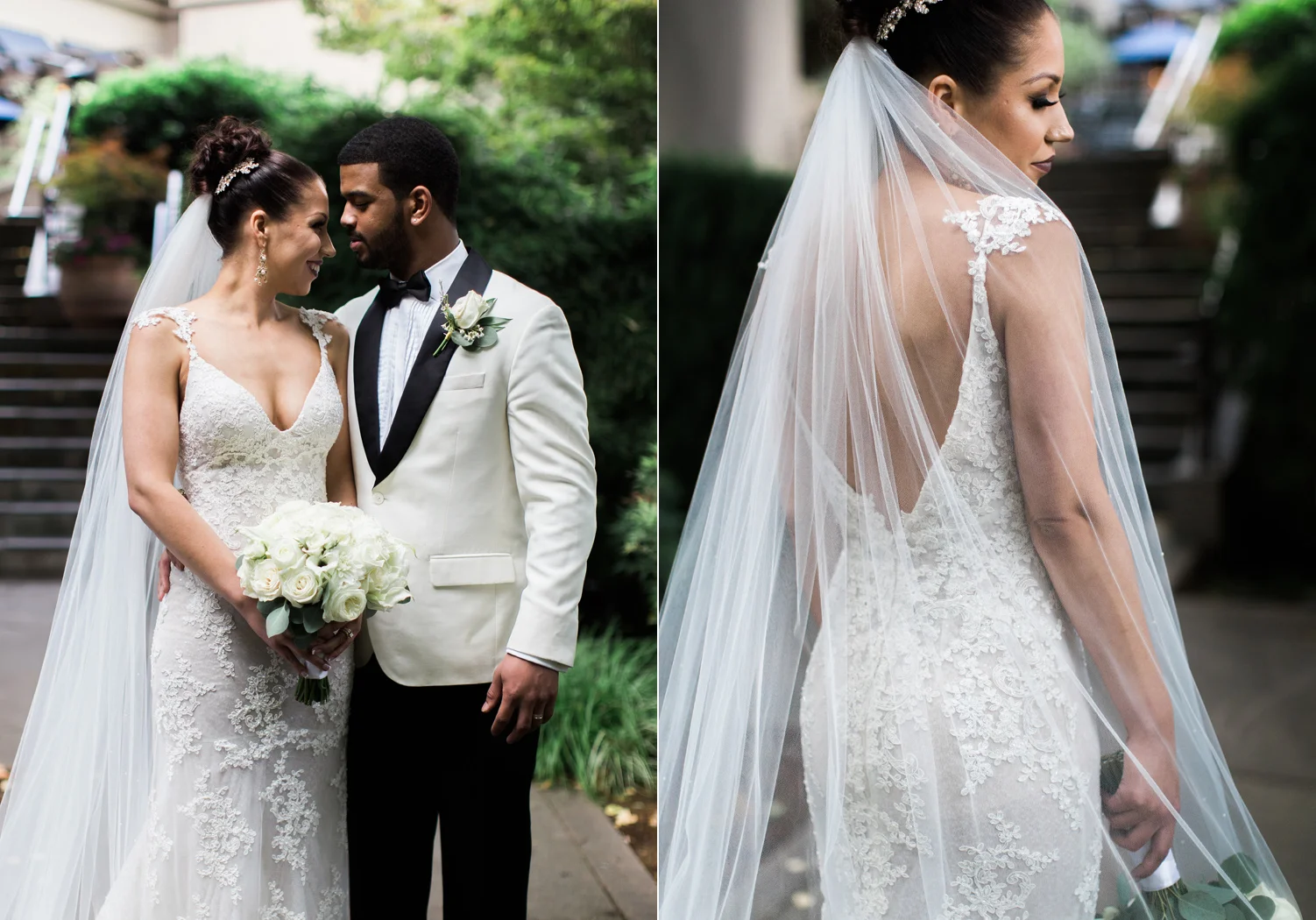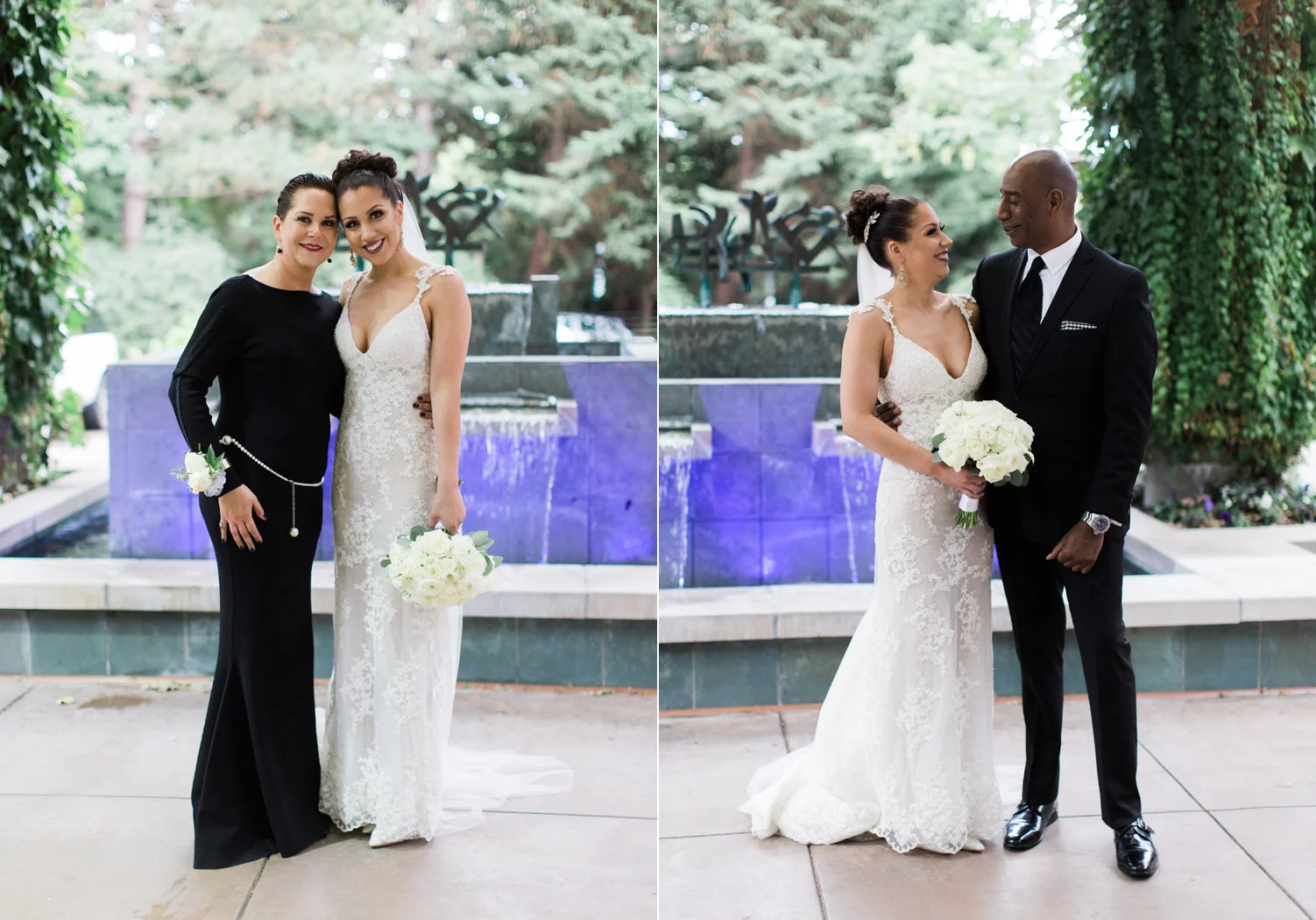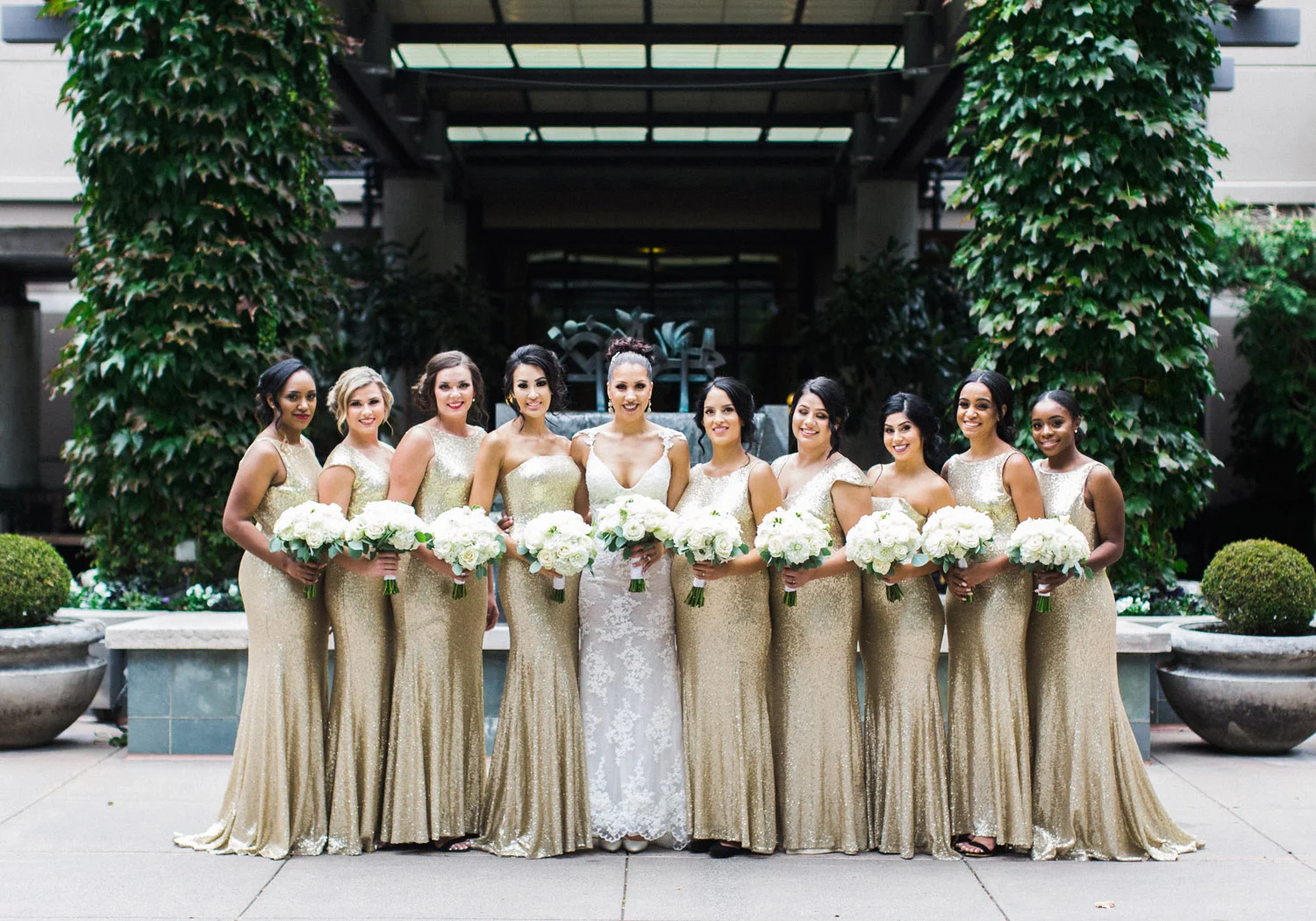 There are elegant weddings and then there are masterfully planned and completely stunning black tie affairs that are memorable beyond all belief. I am so happy to have been Taylor & Ja’Juan’s wedding photographer! When I first met with Taylor she told me of her vision to have a black and gold wedding, very refined, simple but very classic. Her vision came to life in stunning fashion at their wedding held at The Bellevue Club in Bellevue, WA. Taylor’s beautiful lace dress was a perfect compliment to her groom’s creme jacket, along with gold bow ties on all the groomsmen to match the bridesmaids’ dresses. Everything throughout the entire wedding day was so beautiful.