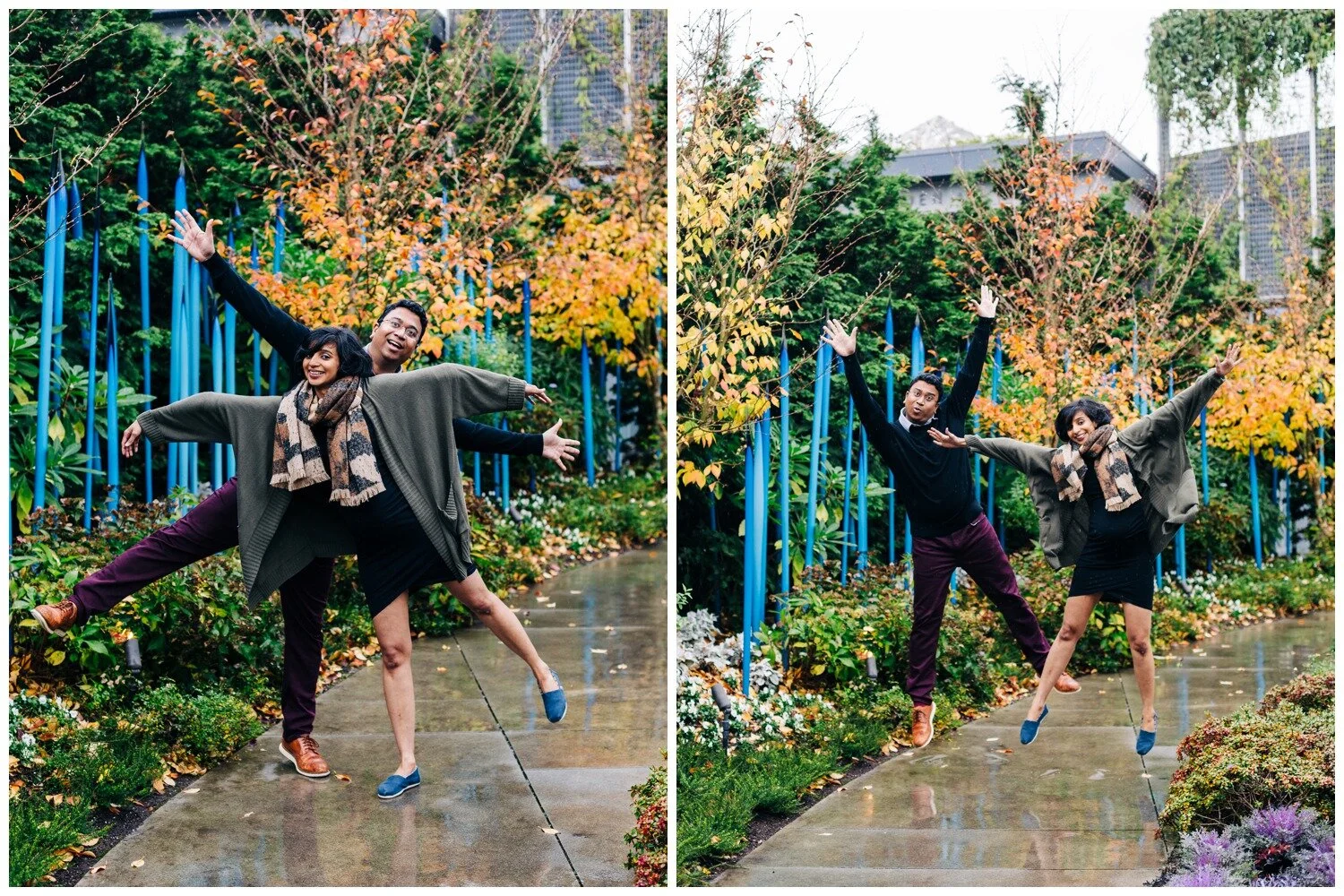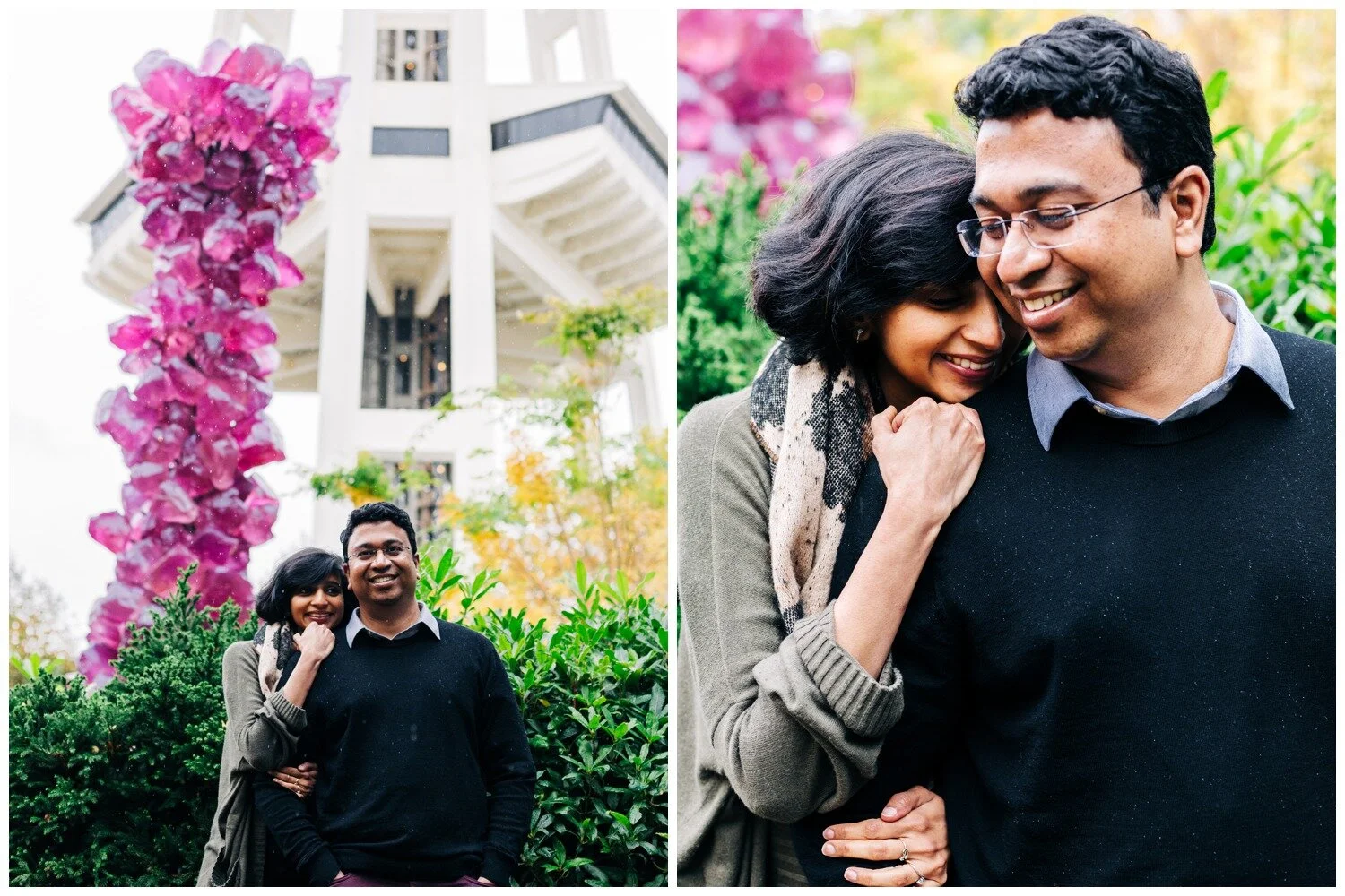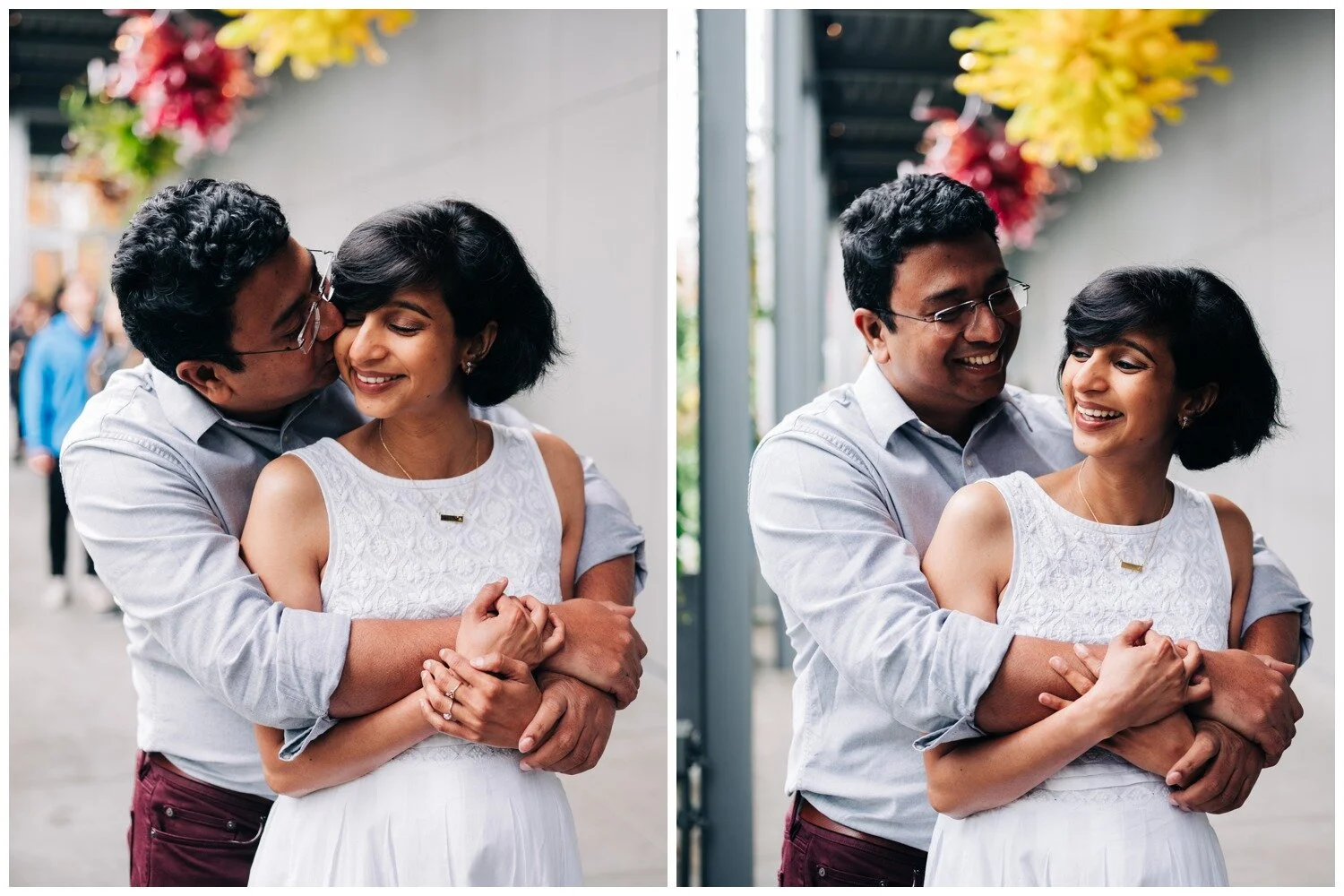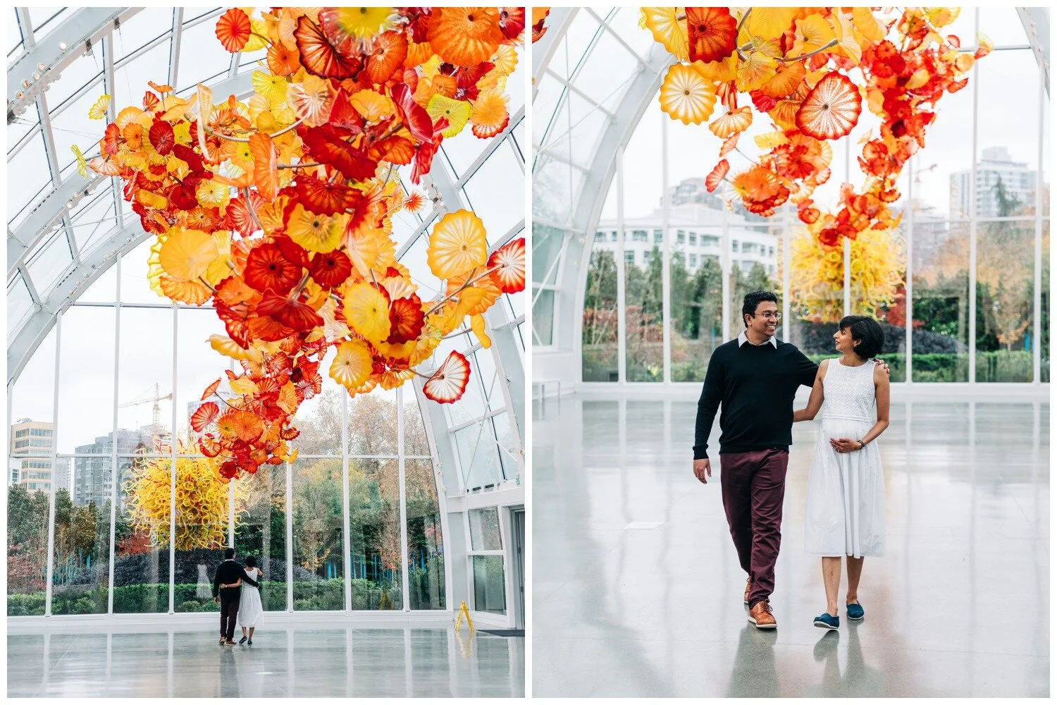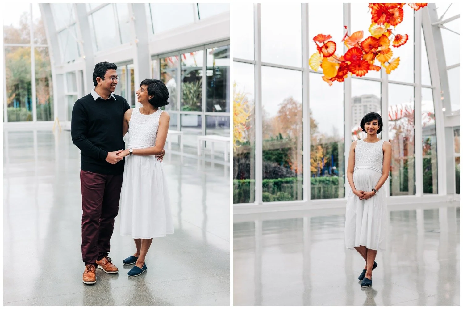 This was truly one of the cutest maternity sessions of all time! Dhrishya found me on Instagram and when she first inquired, telling me that she was thinking of doing a photo session at the Chihuly Garden and Glass in Seattle I was ready for it! To our collective surprise, the museum is (as of this writing) accepting of professional photographers working within the museum space. It takes a little strategy to be able to work best with the crowds of museum-goers to get shots where the space feels fairly empty, but this couple took every bit of advice I offered and we had a wonderful time. Despite rain that started falling mid-way through our time together they remained just as goofy and sweet as they were at the start and I could not get enough of them! I loved all of the personality that came through in these photos without needing any sort of prompts from me. Just a couple months after we snapped these photos Dhrishya welcomed a beautiful and happy baby girl into the world and I am so happy for both new parents, and their adorable new bundle!