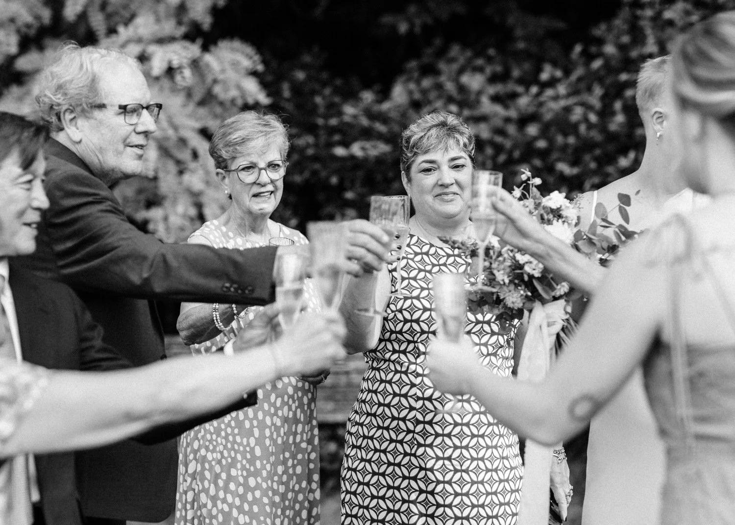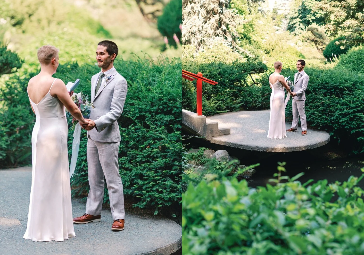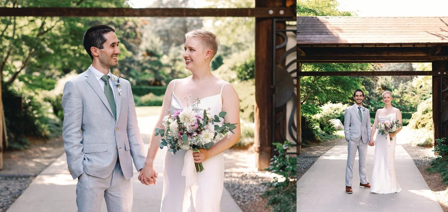 The couple began their photos at the front gate of Seattle’s Kubota Gardens, and then we walked the pathways inside the park for some couples portraits by the ponds and manicured trees before sneaking away to one of the red Japanese-inspired bridges next to a pond for private vows. A ceremony for family followed by photos and toasts rounded out our time together – and then the group was off to a celebratory dinner.