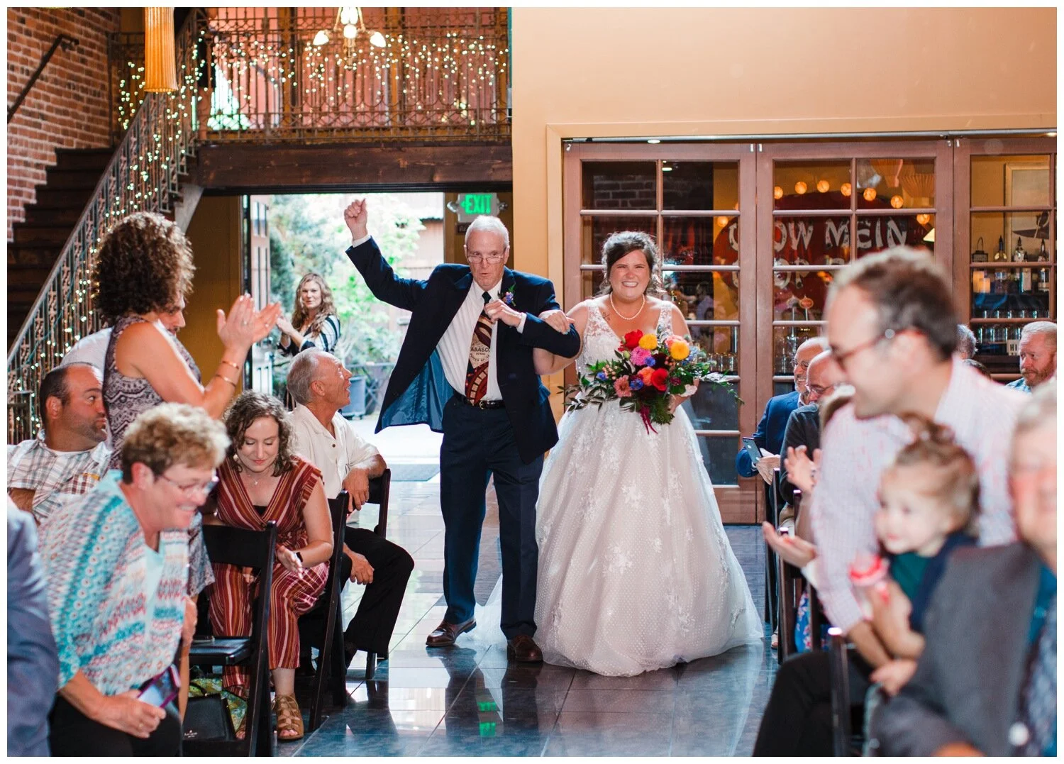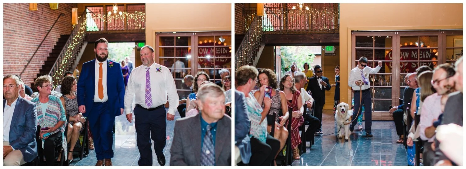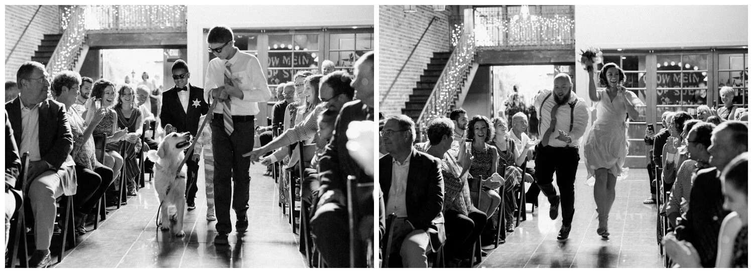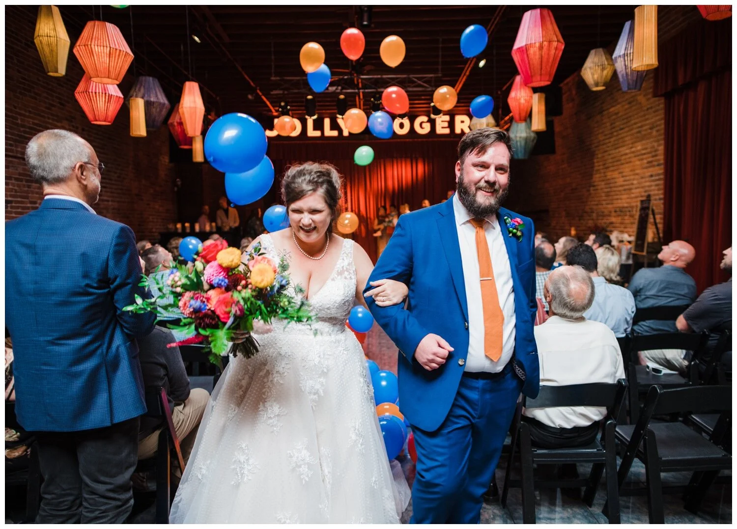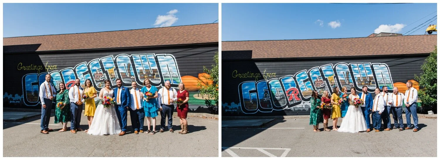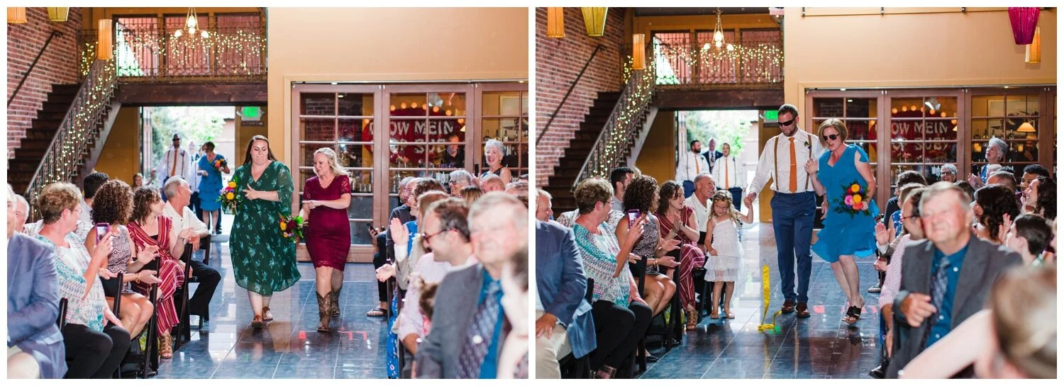 After the couple’s first look we took a walk to Flip Flip Ding Ding! in the Georgetown neighborhood for some relaxing game play and funky wedding party photos. We wanted the wedding party portraits to feel true to the Georgetown vibe – so the wall murals and street art were perfect for this! The couple and their wedding party danced down the aisle during the ceremony and after the “I do”s they recessed under an avalanche of brightly colored balloons. Is there a way that we can do balloon drops at every wedding?