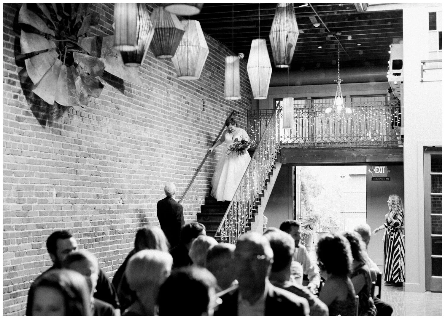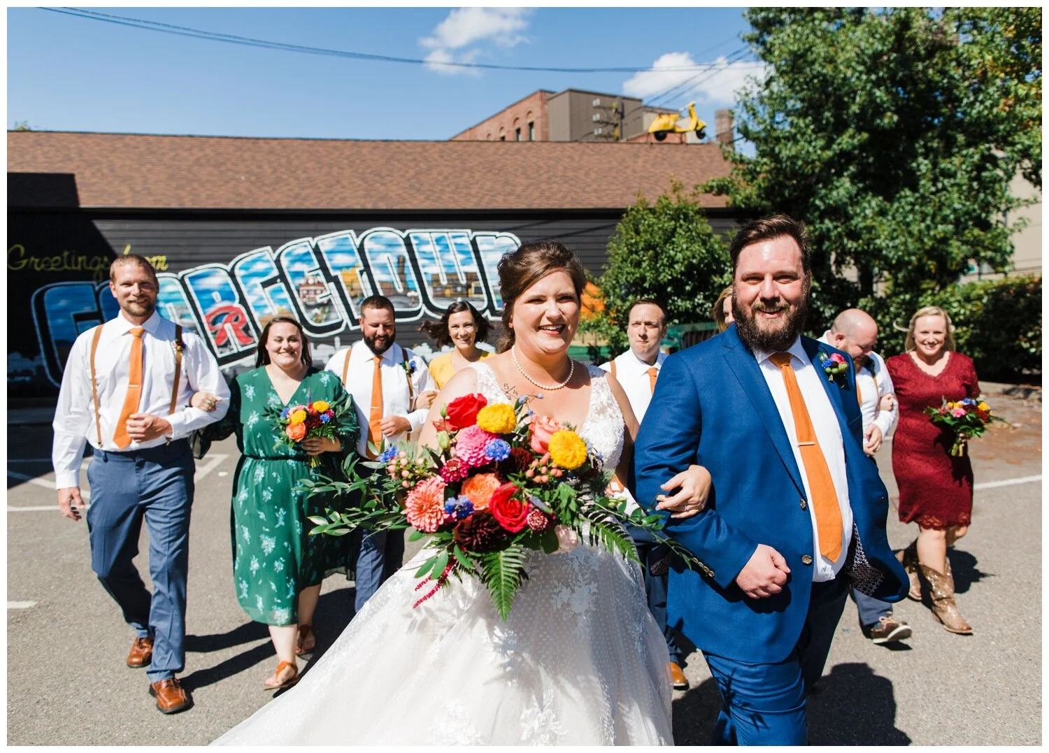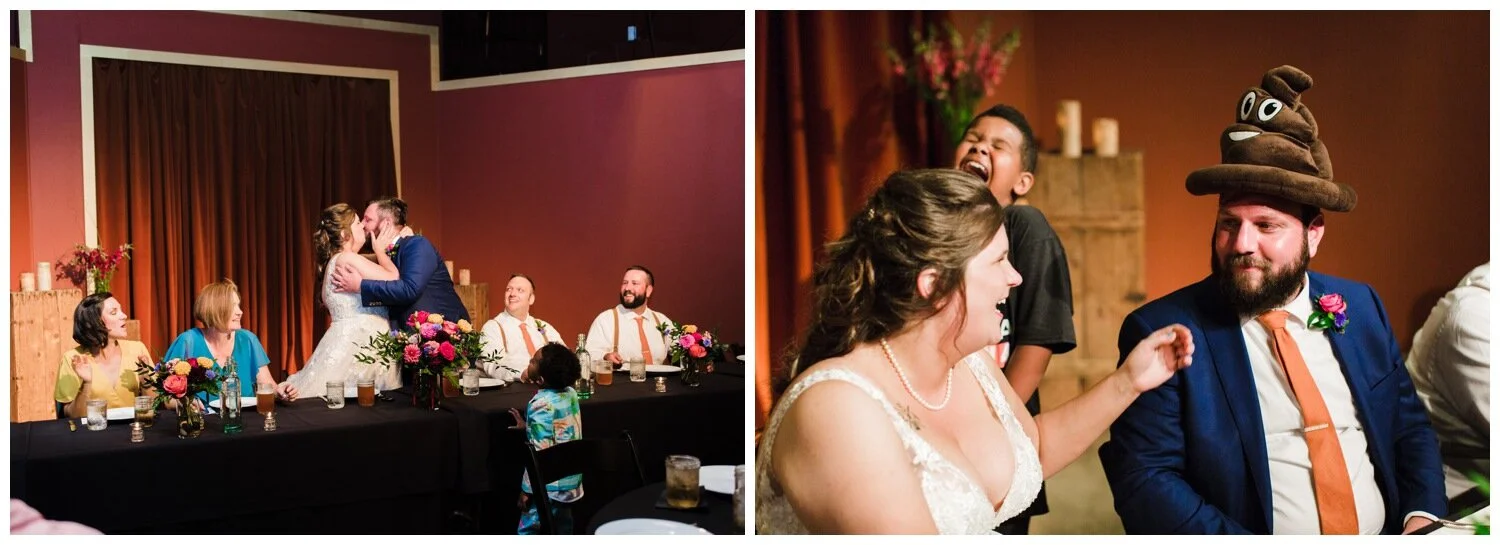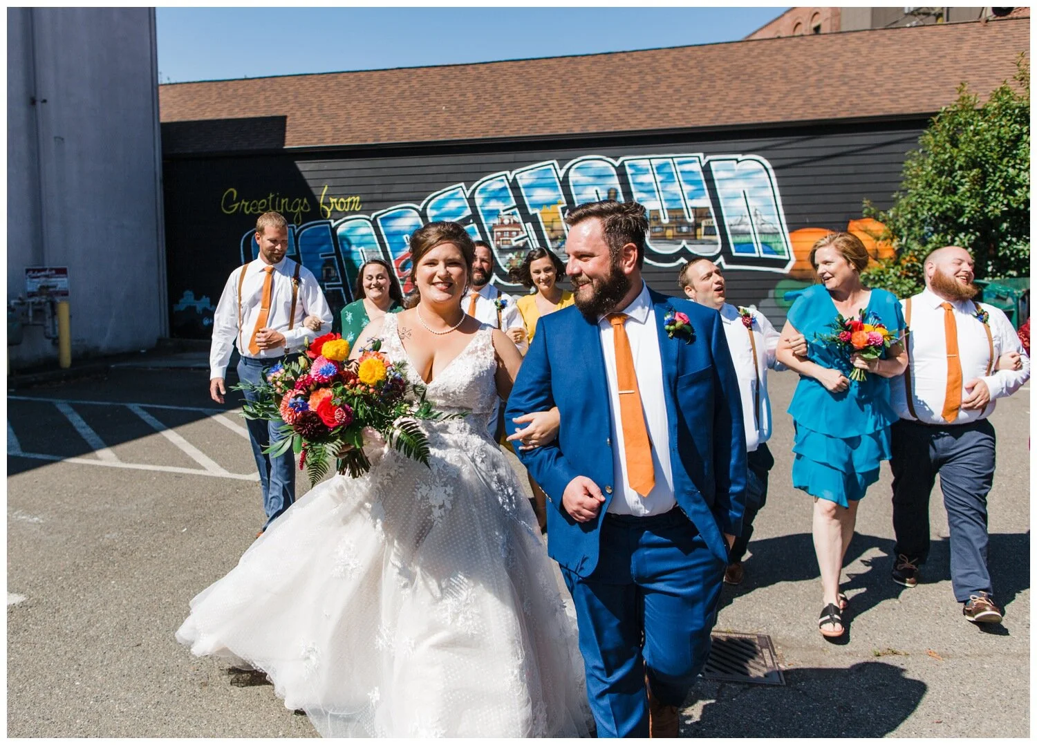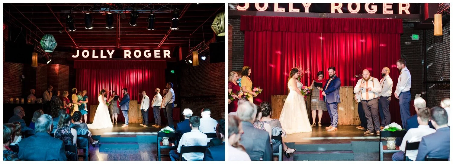 After the couple’s first look we took a walk to Flip Flip Ding Ding! in the Georgetown neighborhood for some relaxing game play and funky wedding party photos. We wanted the wedding party portraits to feel true to the Georgetown vibe – so the wall murals and street art were perfect for this! The couple and their wedding party danced down the aisle during the ceremony and after the “I do”s they recessed under an avalanche of brightly colored balloons. Is there a way that we can do balloon drops at every wedding?