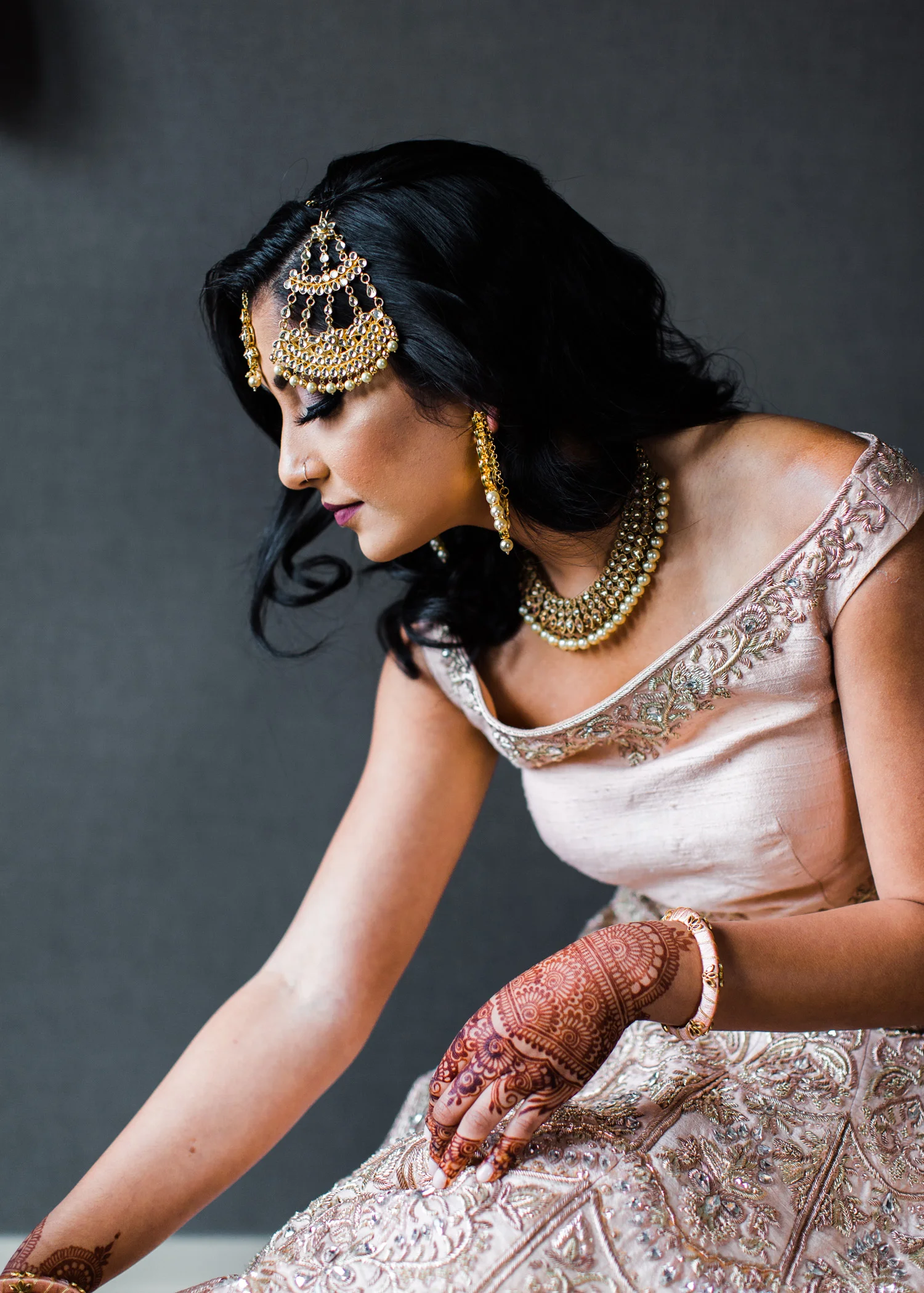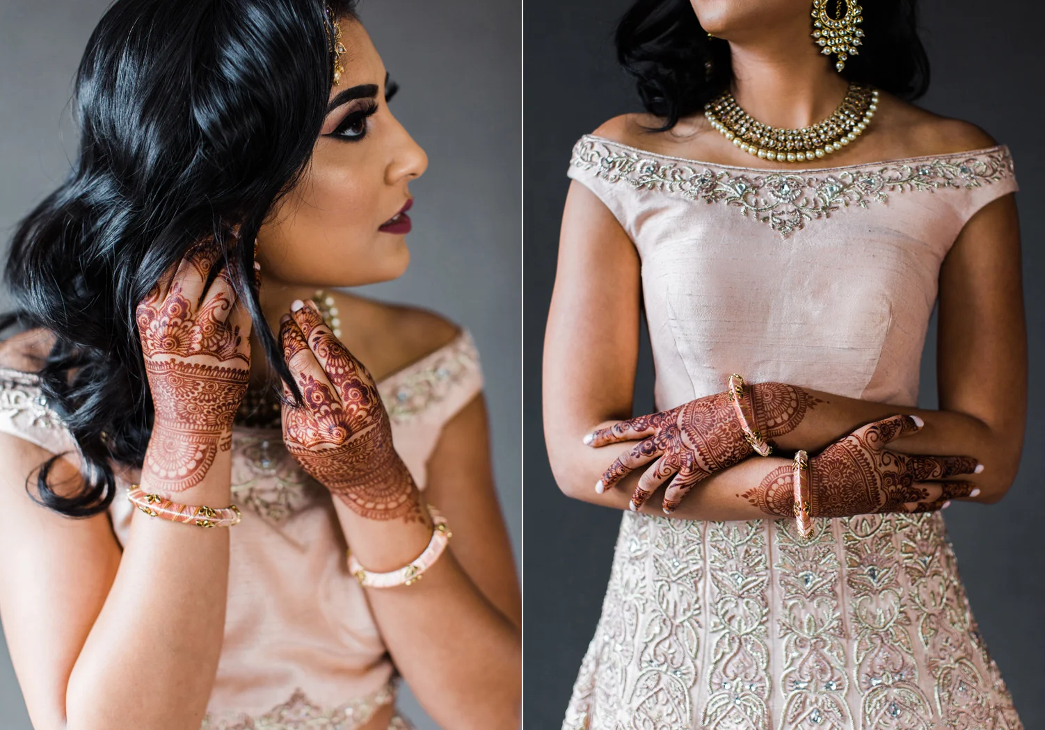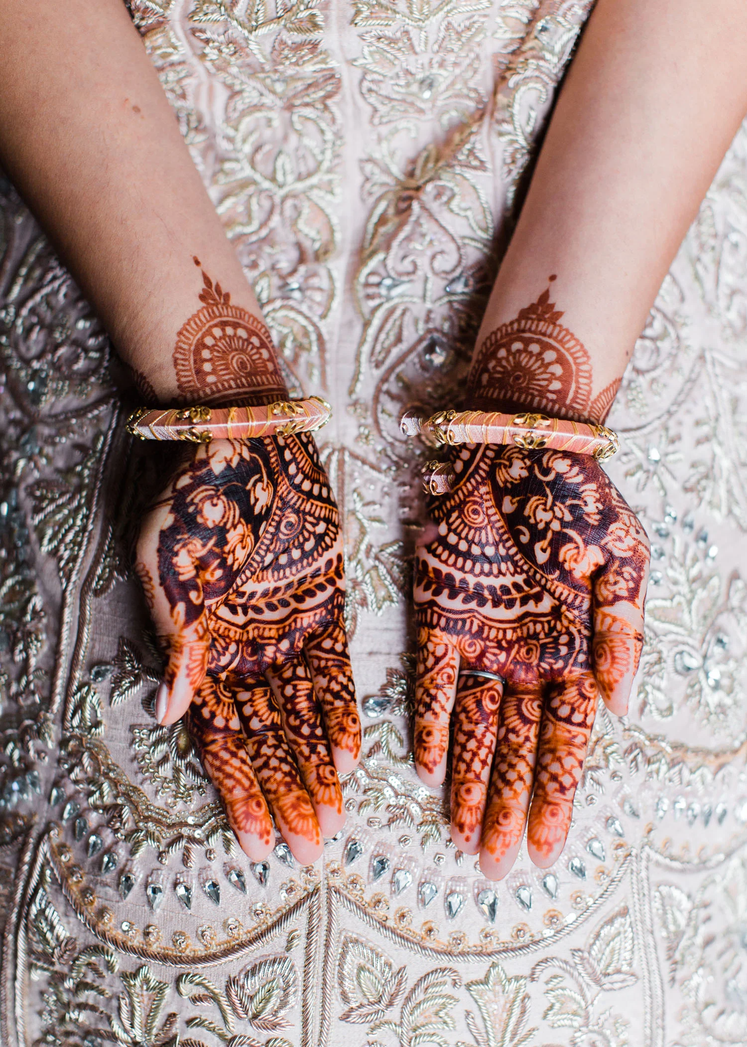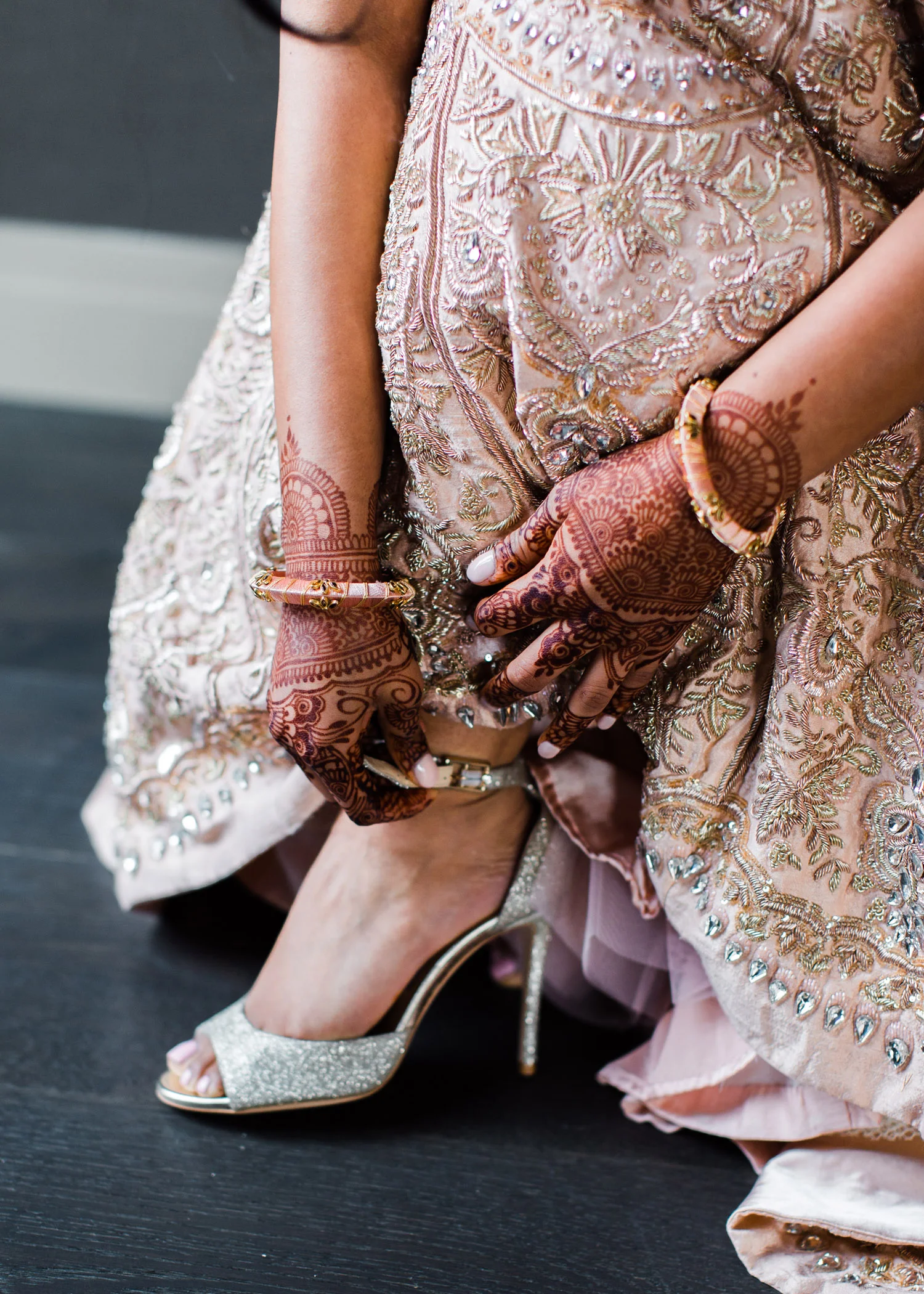 I love all of the tradition that is woven in to the decor, the attire, hair and makeup, and more. When Annu from Always Planning for You reached out to me to ask if I’d be interested in photographing an editorial shoot she was coordinating I jumped at the chance because this vision sounded so amazing. An Indian bride and groom in traditional wedding attire – except the colors are pushing the limits of “traditional” by a color other than red. Instead, we embraced popular color trends and chose gold and blush pink as the dominant colors of the shoot. Thanks to Annu’s great coordination, gold and pink were woven into every aspect of this styled wedding – the table settings, florals, mandap ceremony backdrop, wardrobe, invitation suite, jewelry and so much more. Please scroll down to see every detail including the incredible henna work. Every vendor included in this shoot worked so hard and they are all listed below for you to follow!