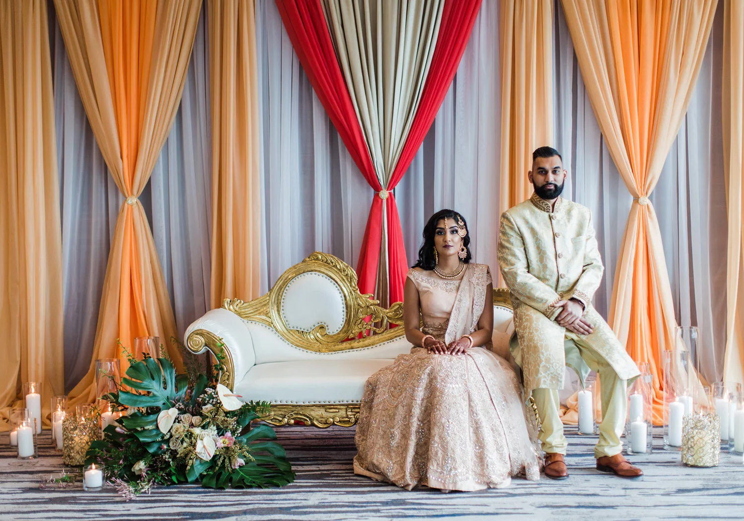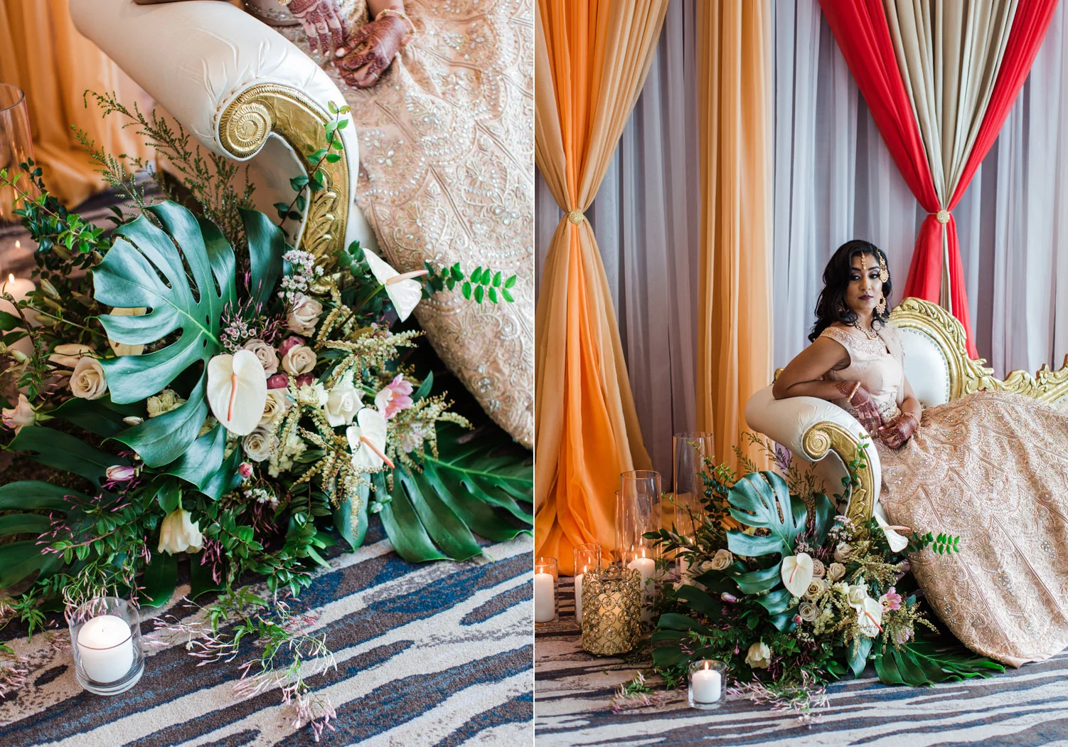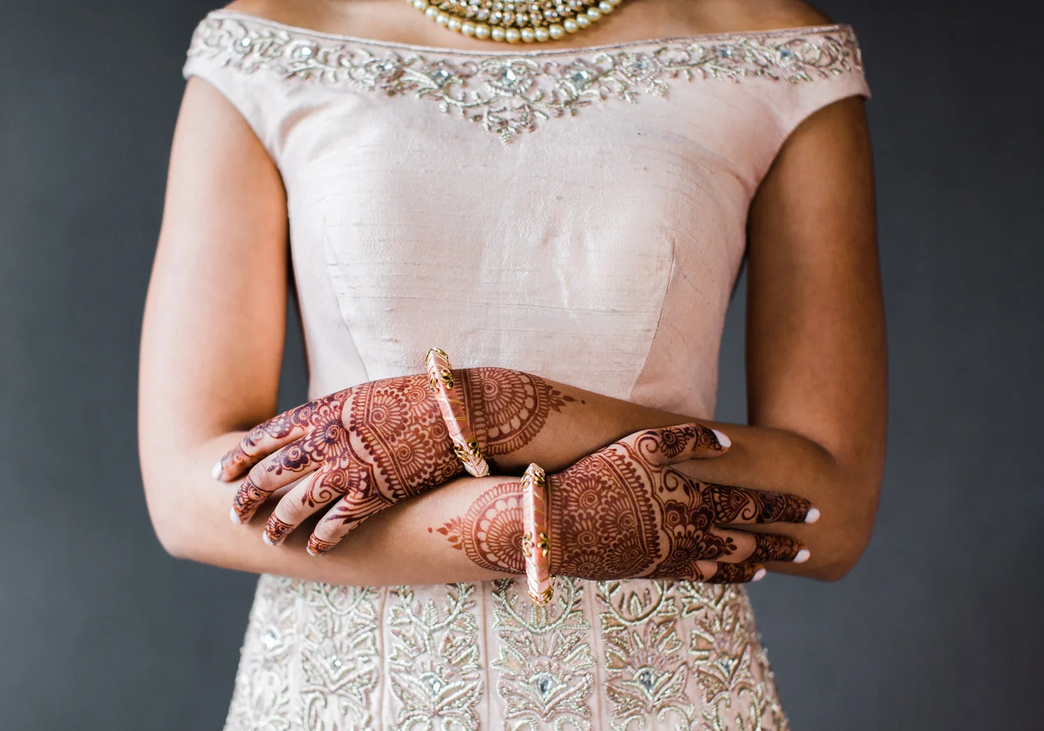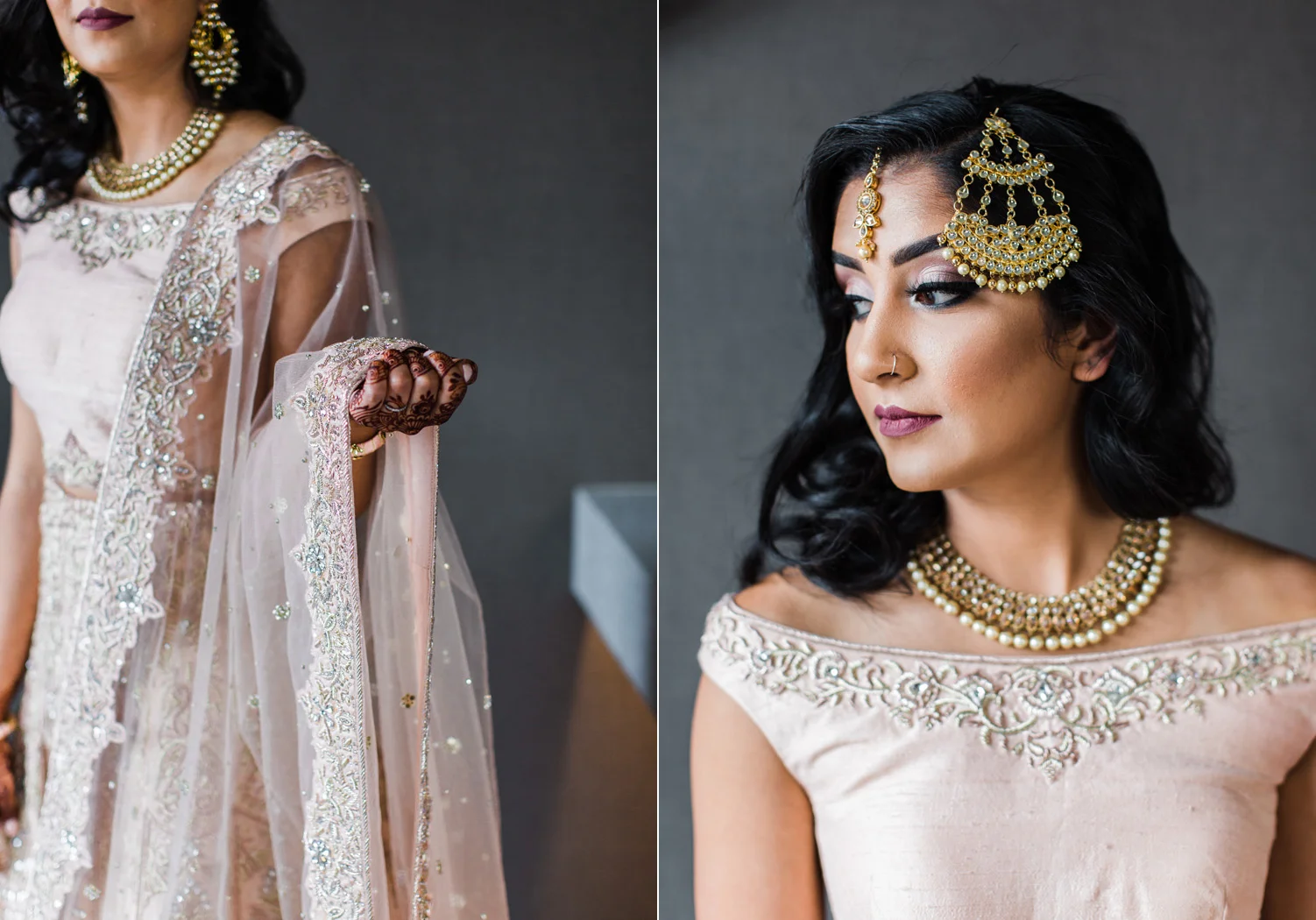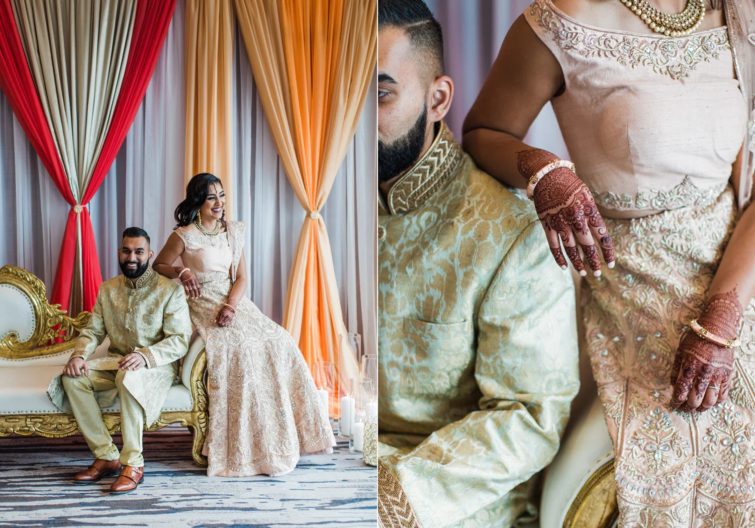 I love all of the tradition that is woven in to the decor, the attire, hair and makeup, and more. When Annu from Always Planning for You reached out to me to ask if I’d be interested in photographing an editorial shoot she was coordinating I jumped at the chance because this vision sounded so amazing. An Indian bride and groom in traditional wedding attire – except the colors are pushing the limits of “traditional” by a color other than red. Instead, we embraced popular color trends and chose gold and blush pink as the dominant colors of the shoot. Thanks to Annu’s great coordination, gold and pink were woven into every aspect of this styled wedding – the table settings, florals, mandap ceremony backdrop, wardrobe, invitation suite, jewelry and so much more. Please scroll down to see every detail including the incredible henna work. Every vendor included in this shoot worked so hard and they are all listed below for you to follow!