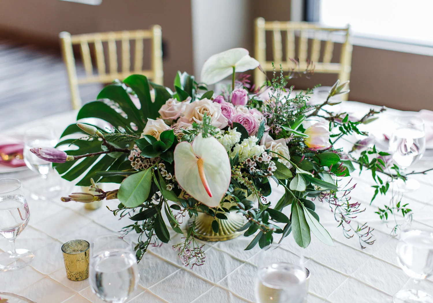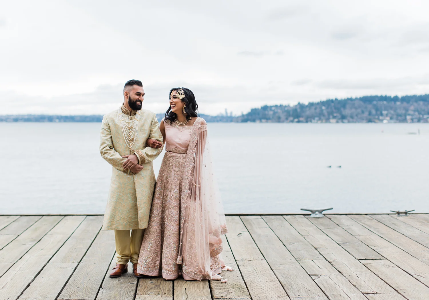 This venue is perfectly tailored to host a large wedding thanks to the multiple ballrooms available, the grand staircase that was perfect for photos with our bride and groom, plus access to a rooftop balcony and dock along the lakeside. Our bride and groom in their gold and blush pink attire look perfectly in place next to the cool blue tones of the lake and the hills surrounding the venue.