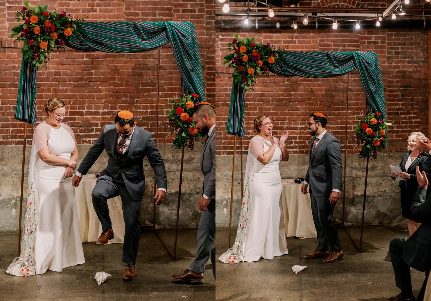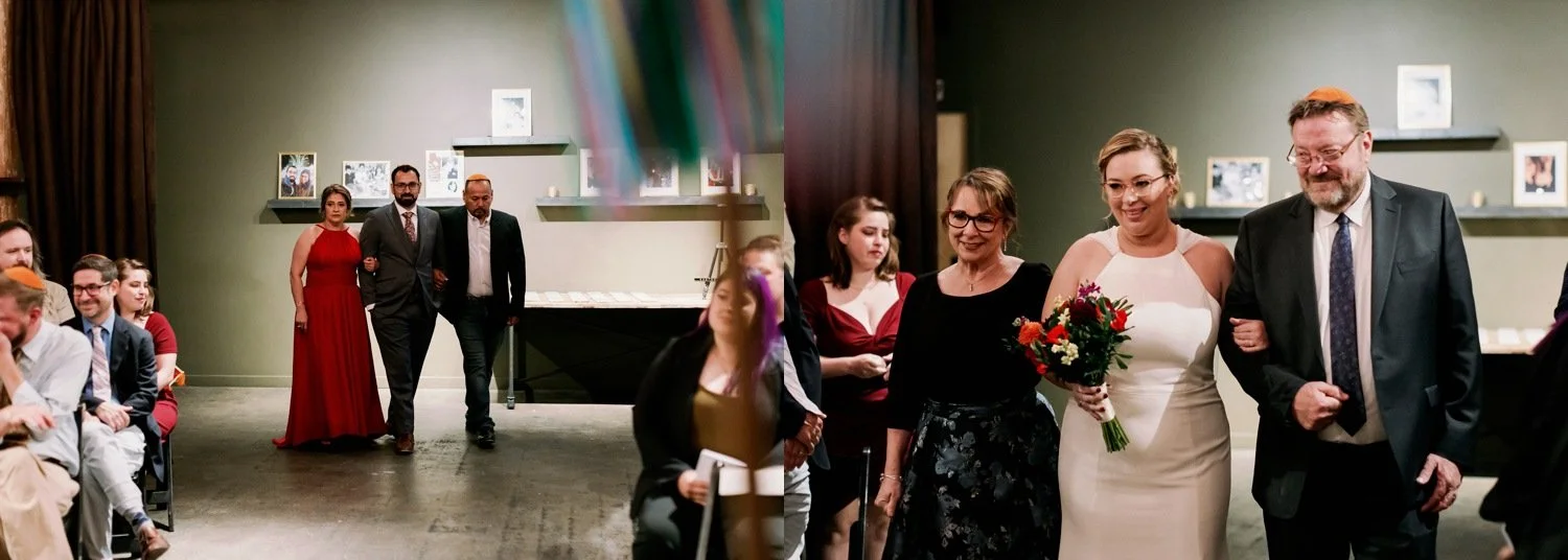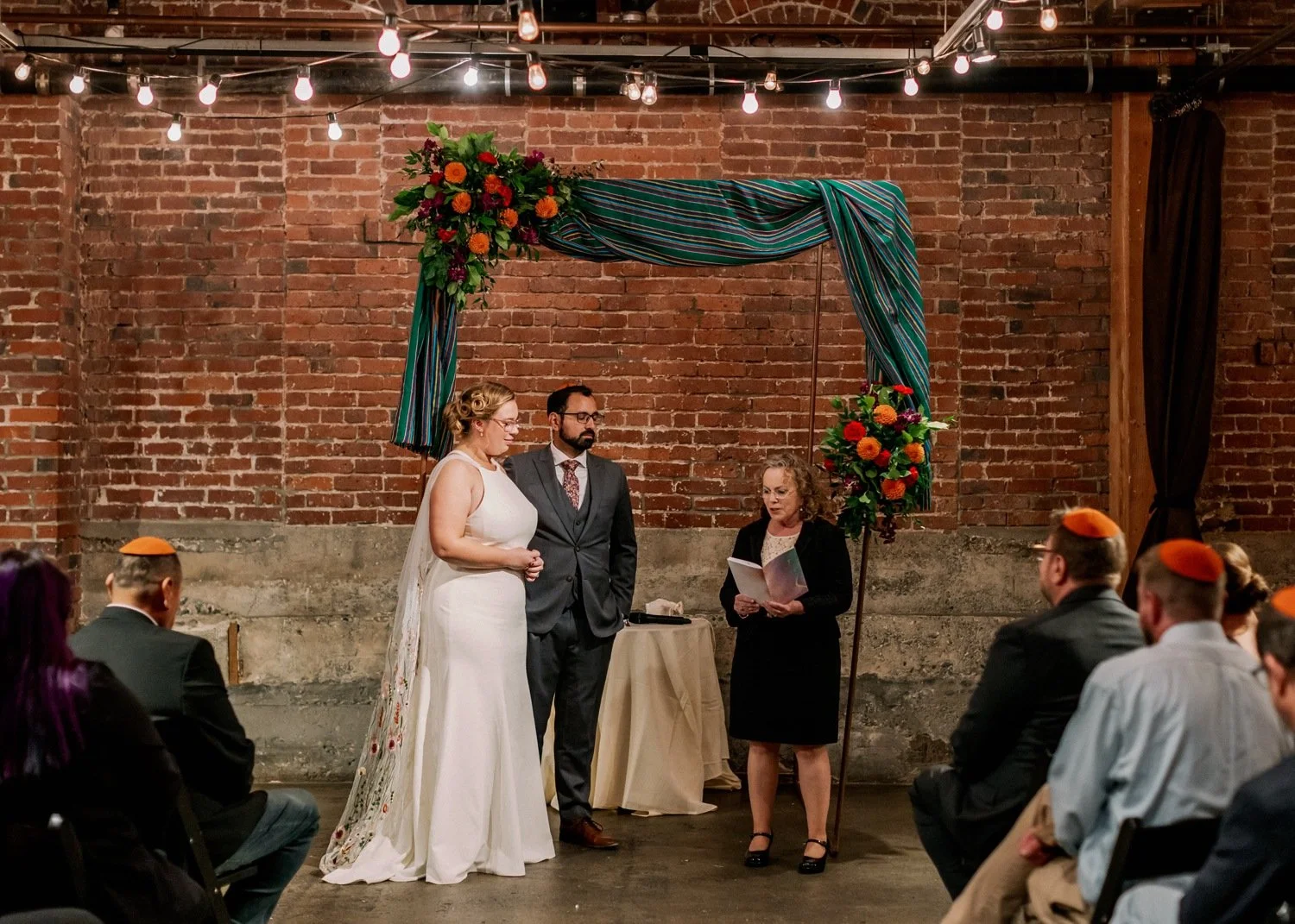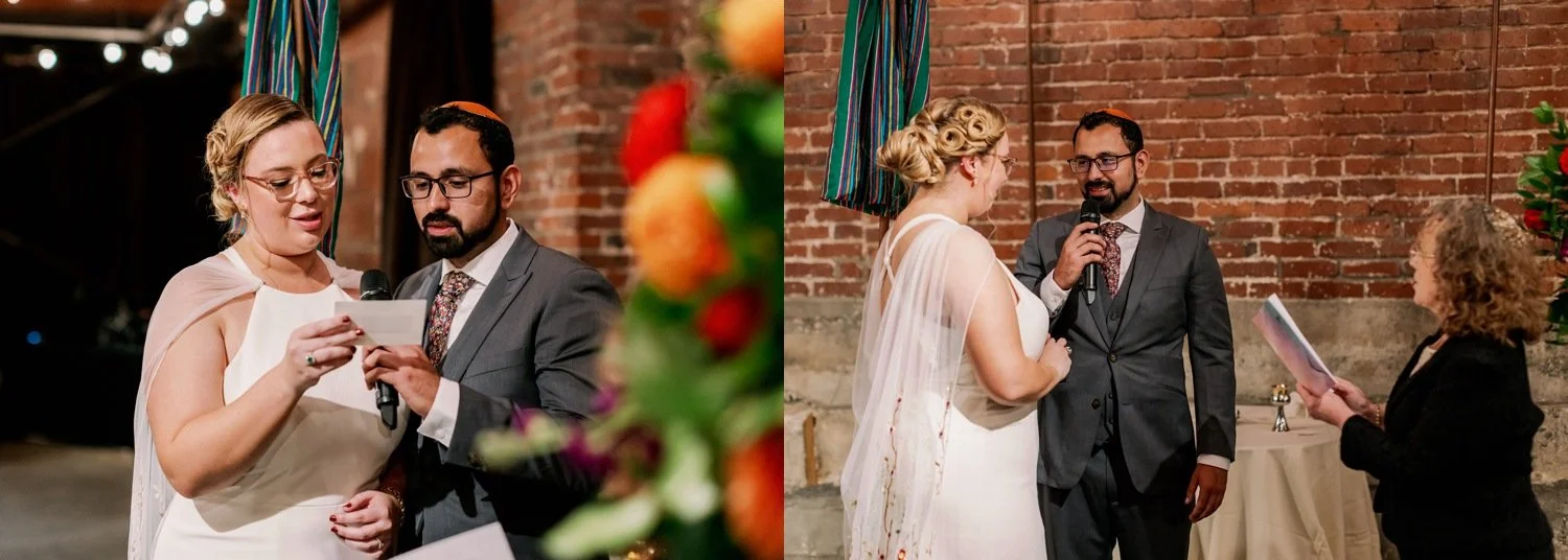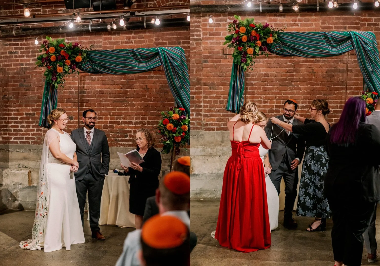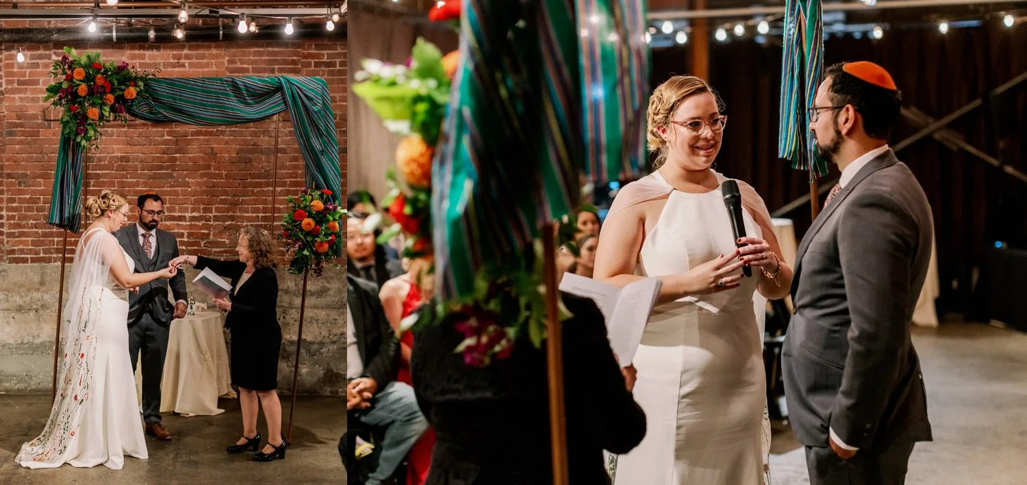 Check out ALLLLLL the color jam packed into Dominique & Victor’s wonderful wedding at Melrose Market Studios in Seattle! This wedding was so fulfilling to document thanks to all of the personal touches incorporating Vince’s Latin American heritage, the couple’s Jewish ceremony under the chuppah, the groom’s love of dinosaurs and the bride’s classic wedding style accented by a colorful embroidered veil. You MUST see the veil! Or is it a cape? Either way I could have photographed this bride and her impeccable bridal ensemble for hours.