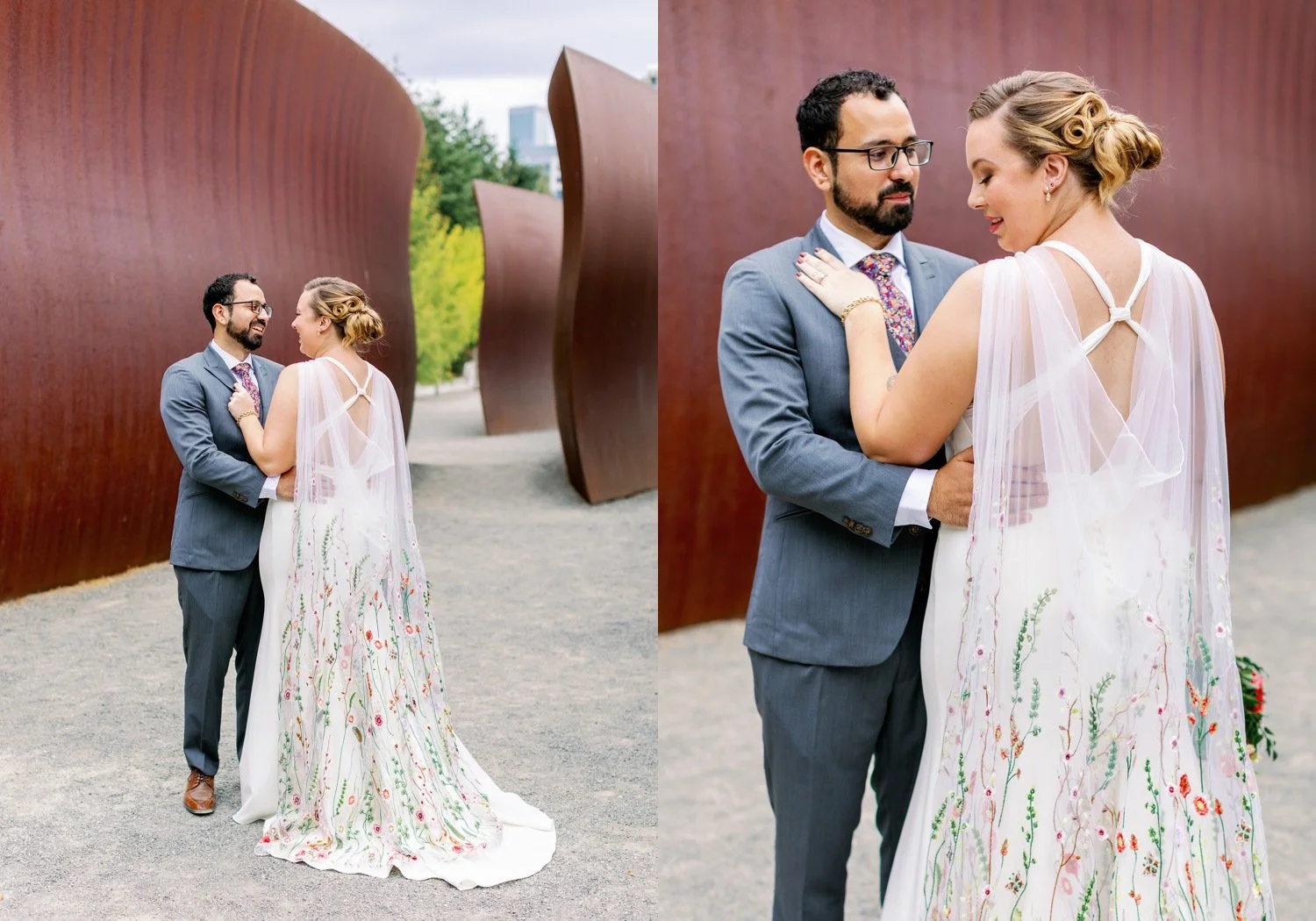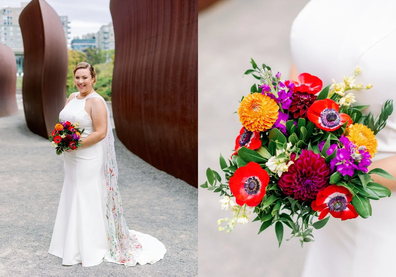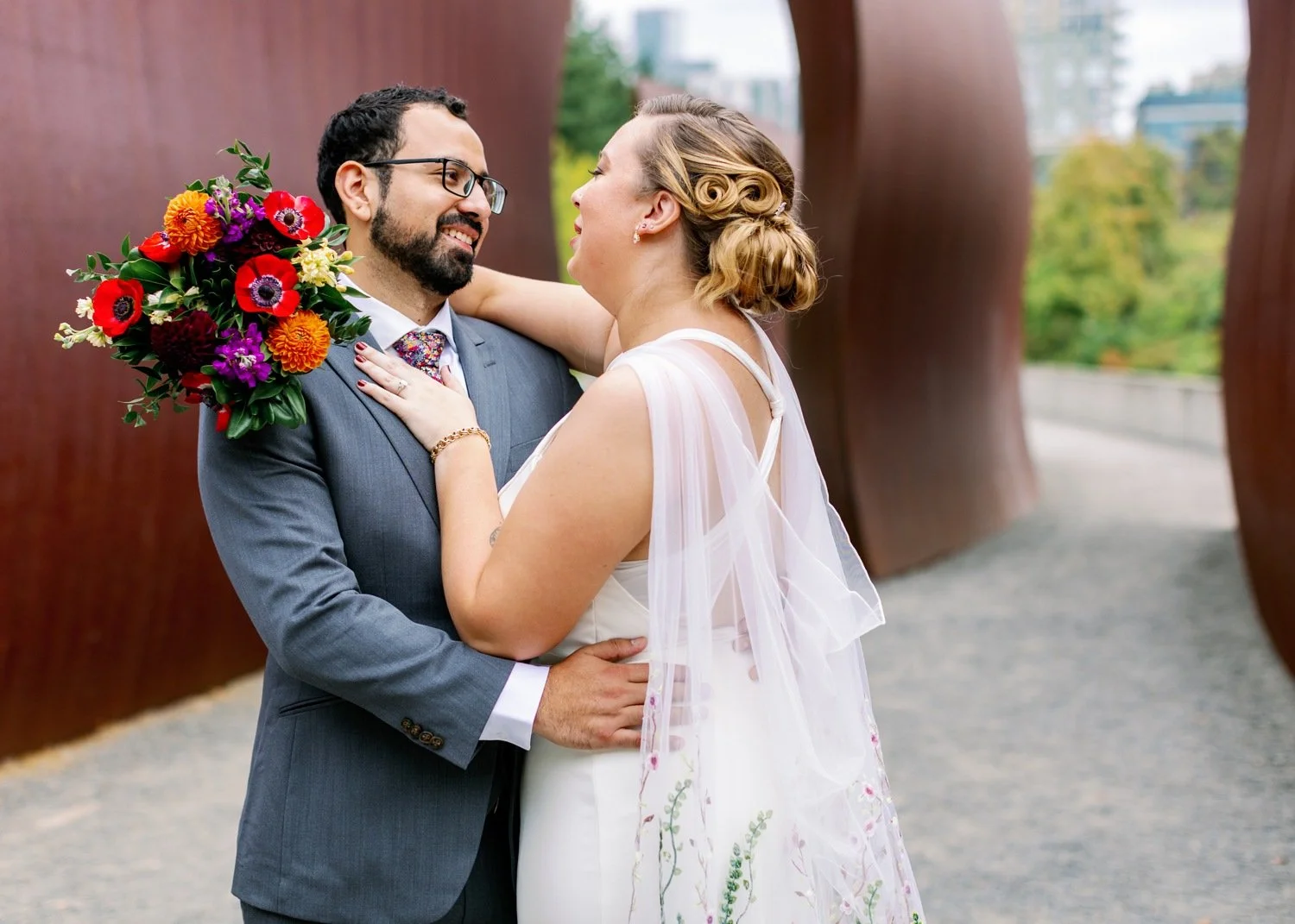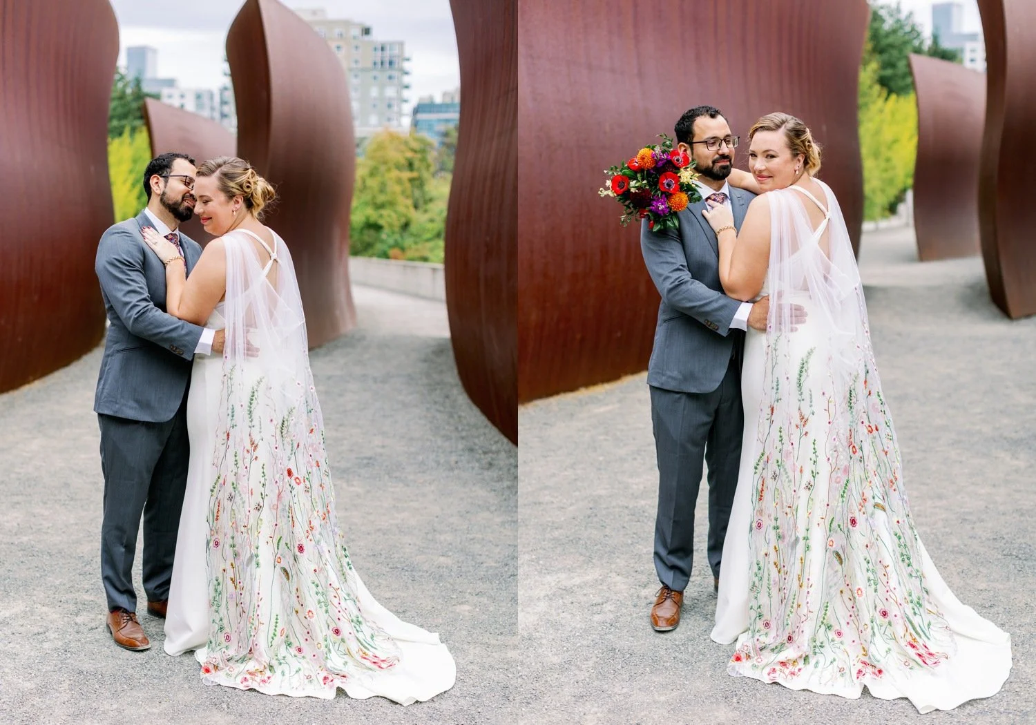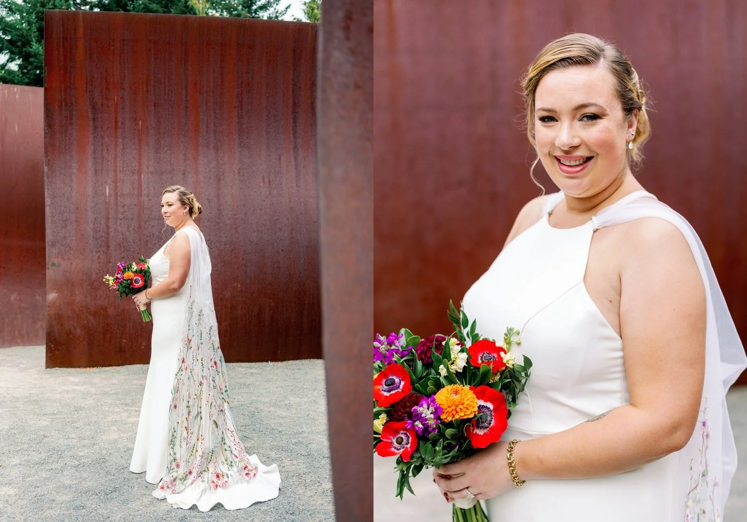 Check out ALLLLLL the color jam packed into Dominique & Victor’s wonderful wedding at Melrose Market Studios in Seattle! This wedding was so fulfilling to document thanks to all of the personal touches incorporating Vince’s Latin American heritage, the couple’s Jewish ceremony under the chuppah, the groom’s love of dinosaurs and the bride’s classic wedding style accented by a colorful embroidered veil. You MUST see the veil! Or is it a cape? Either way I could have photographed this bride and her impeccable bridal ensemble for hours.