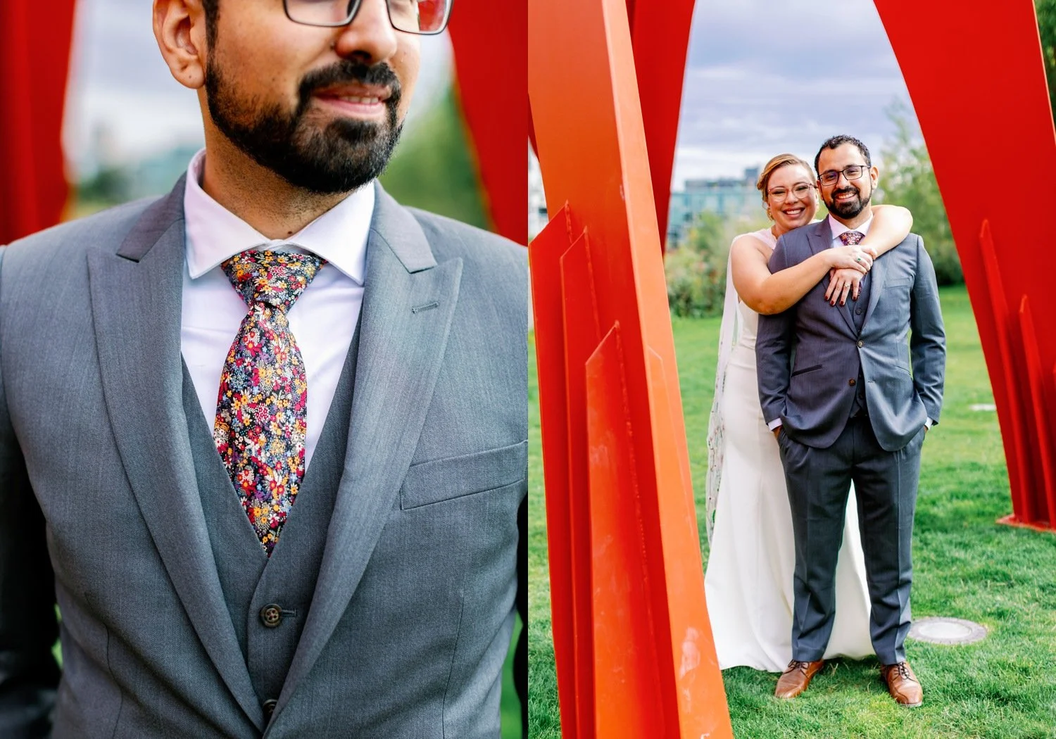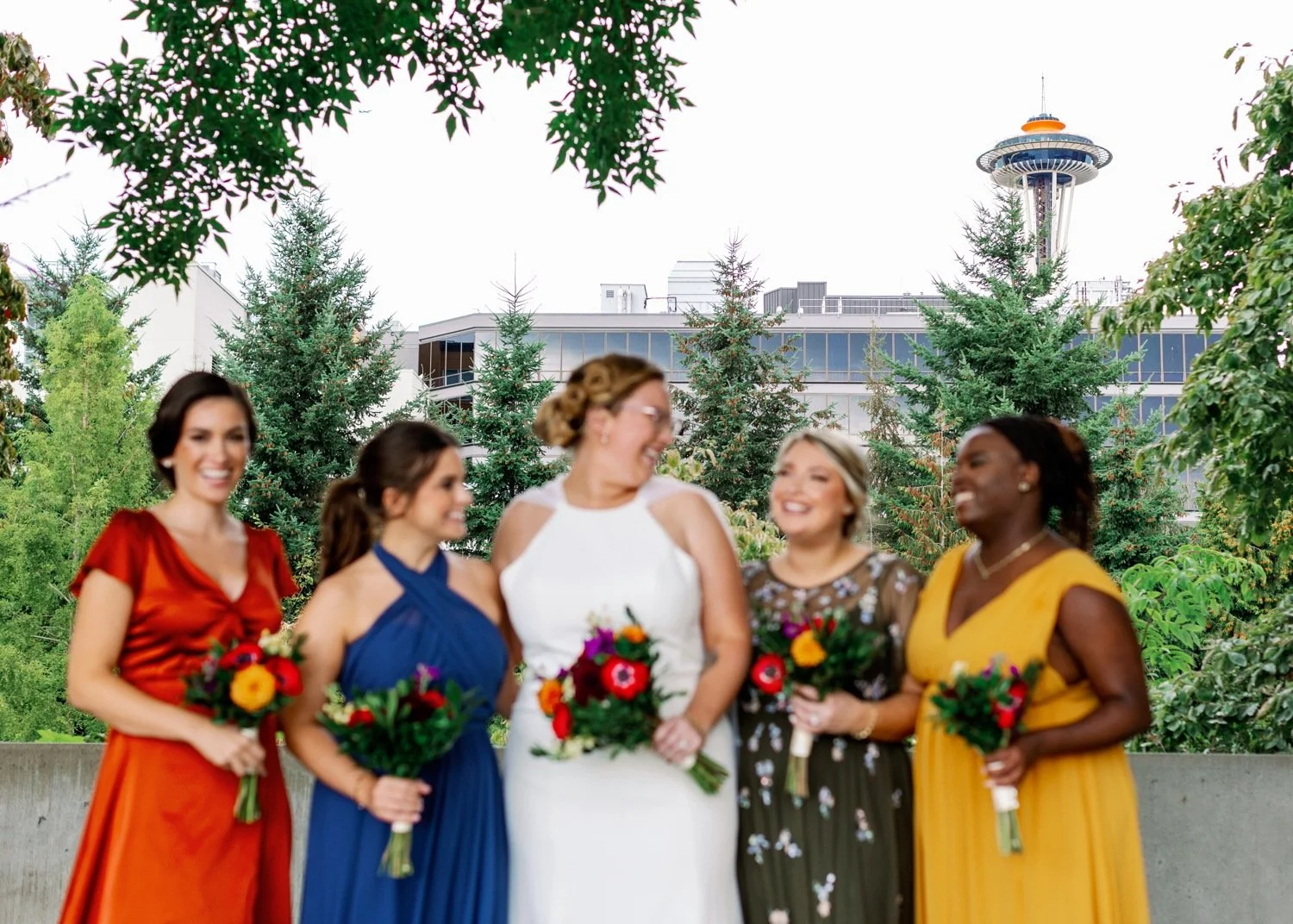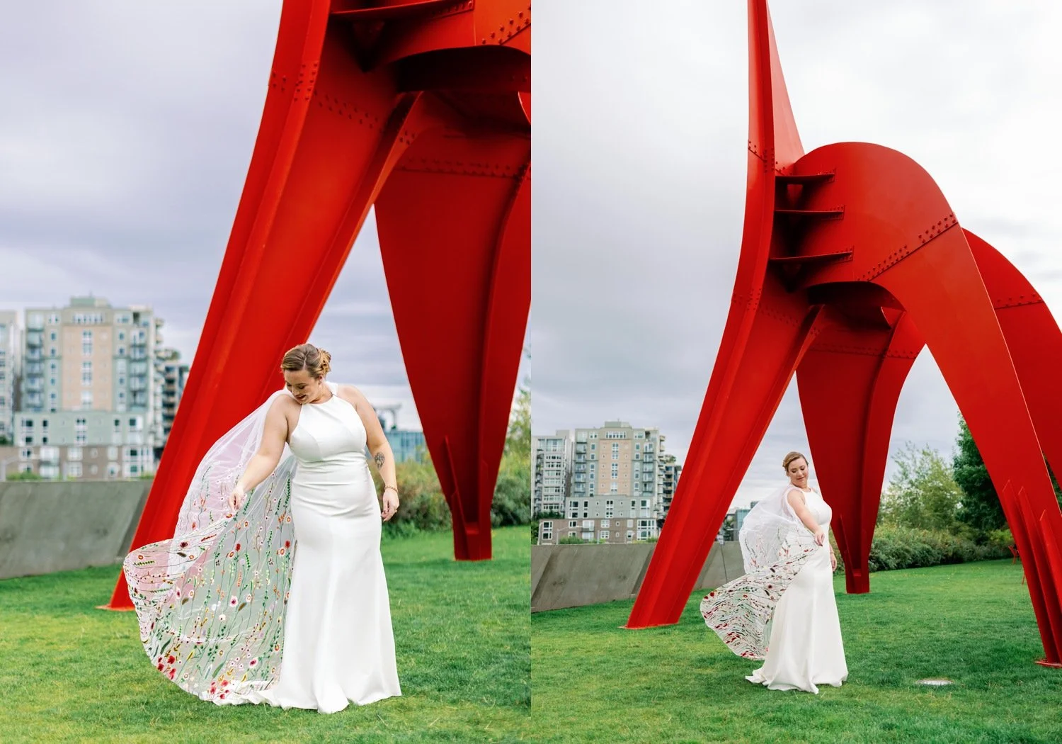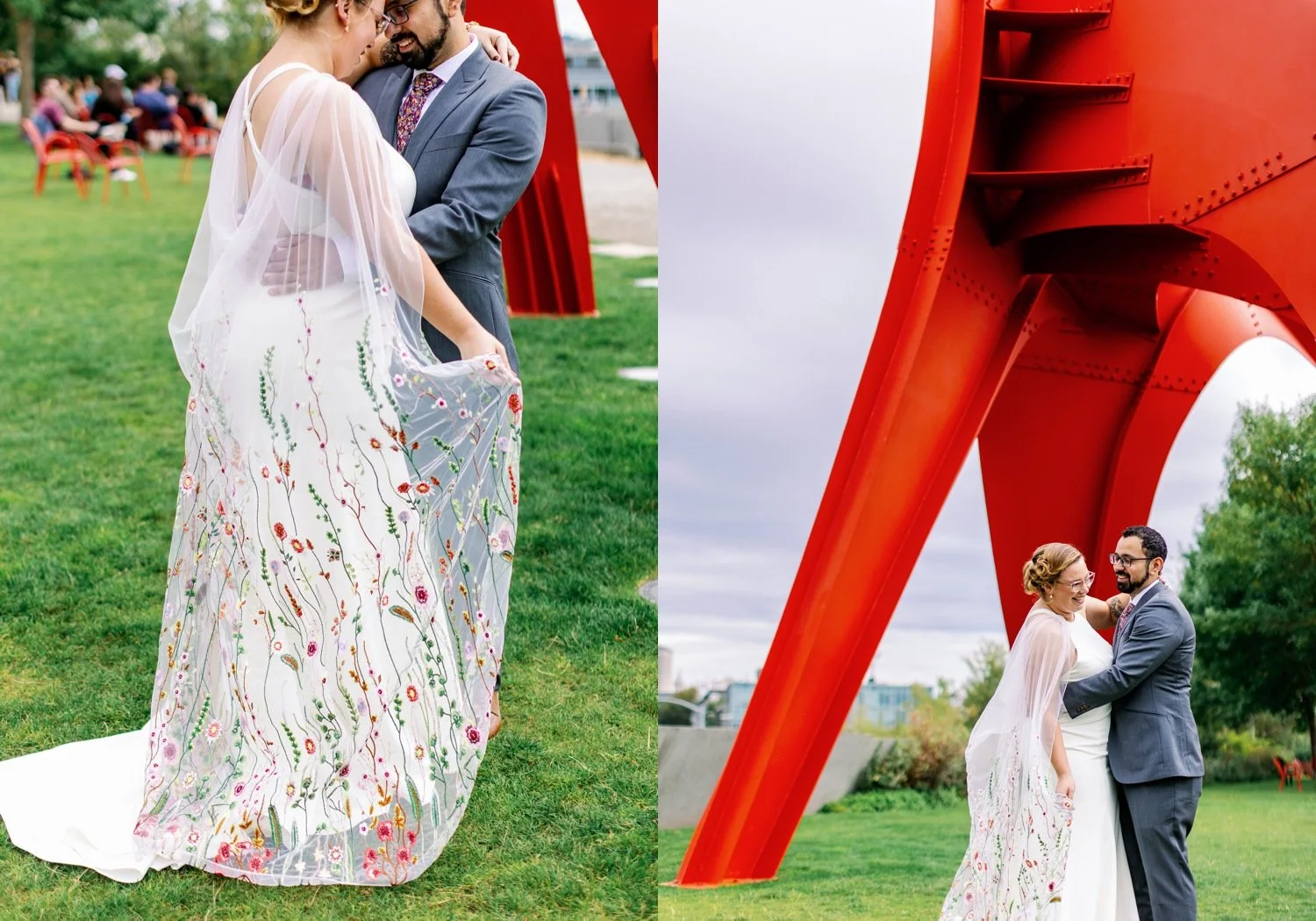 Check out ALLLLLL the color jam packed into Dominique & Victor’s wonderful wedding at Melrose Market Studios in Seattle! This wedding was so fulfilling to document thanks to all of the personal touches incorporating Vince’s Latin American heritage, the couple’s Jewish ceremony under the chuppah, the groom’s love of dinosaurs and the bride’s classic wedding style accented by a colorful embroidered veil. You MUST see the veil! Or is it a cape? Either way I could have photographed this bride and her impeccable bridal ensemble for hours.