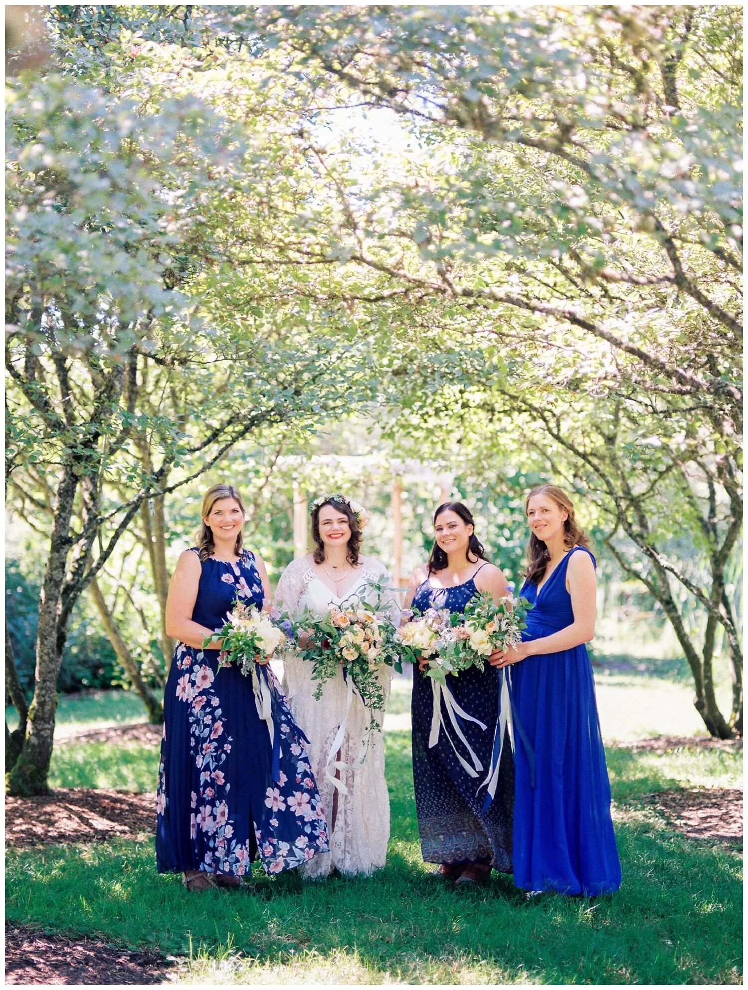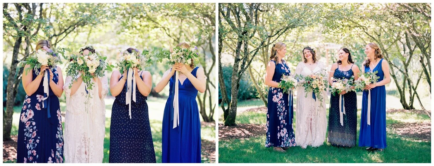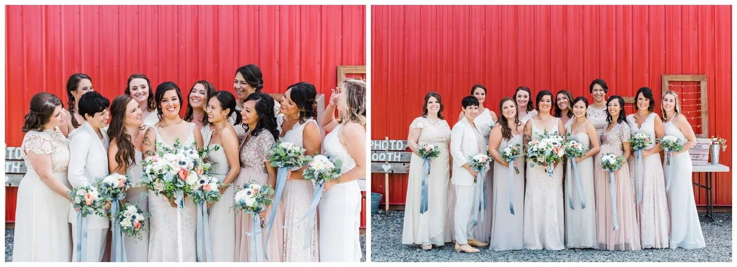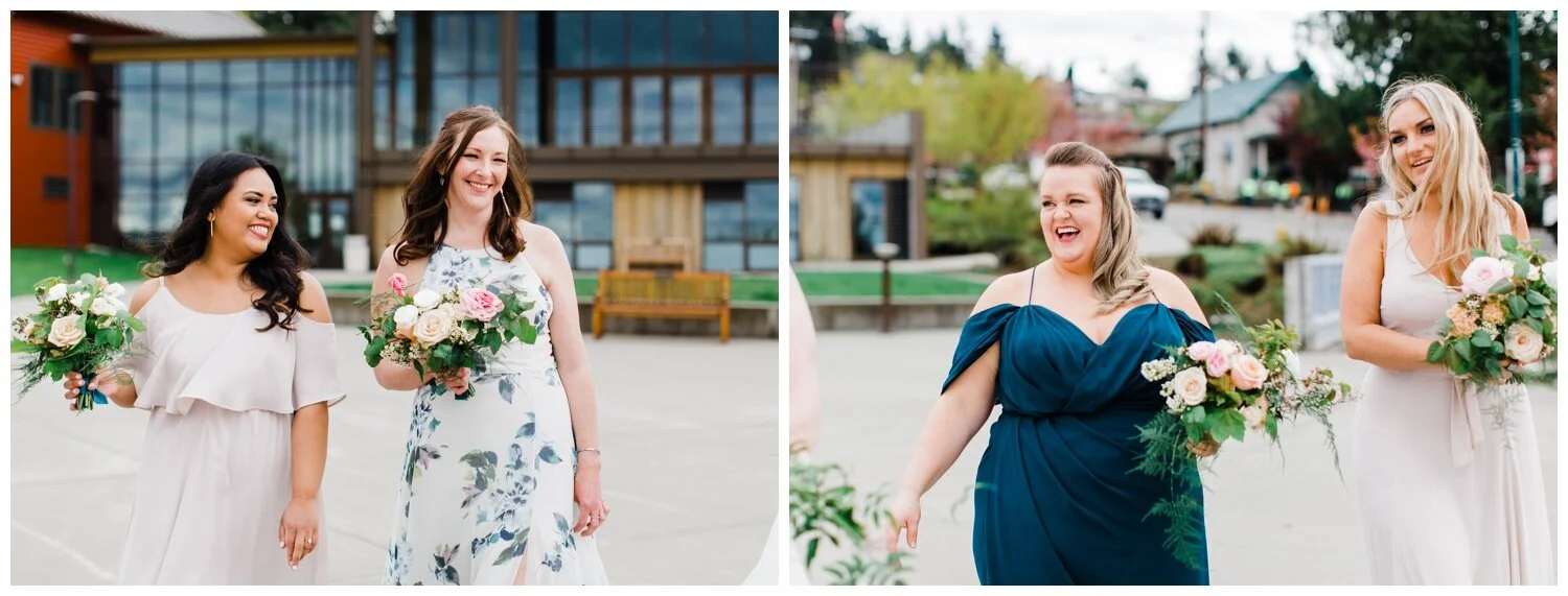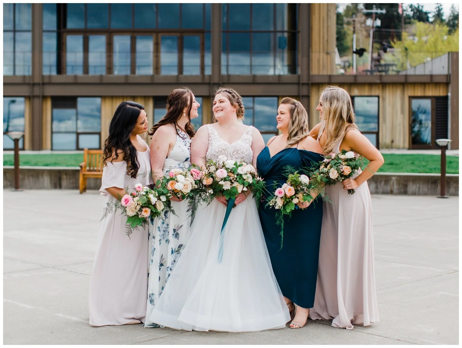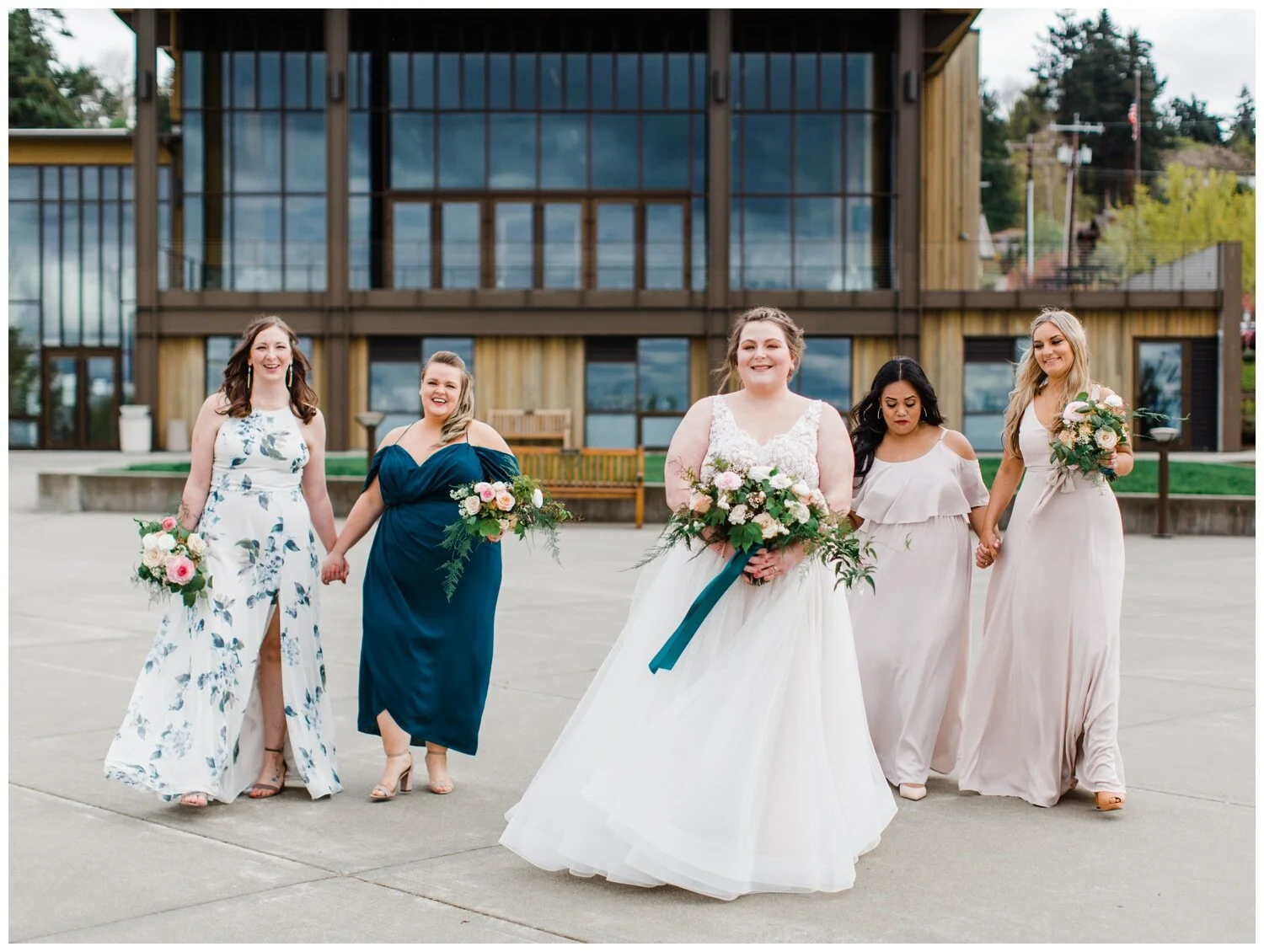 Anytime I photograph a Seattle wedding and the wedding party is wearing a variety of colors, patterns and styles my heart skips a beat. I love seeing a color palette come to life across different dresses and I think it’s really fun to be able to give bridesmaids freedom to choose their own dress style and color for your wedding (within your chosen parameters, of course). Coordinated, matching wedding parties are still the norm but the mismatched look is something that you should seriously consider for your wedding, especially if you are having trouble settling on a specific color or dress style, or are choosing to have a more relaxed vibe at your wedding. Did I mention that I think mismatched bridesmaid dresses photograph incredibly well? To provide you with a little inspiration, here are five of the most gorgeous wedding parties with mismatched bridesmaid dresses that I’ve gotten to photograph and why I think each one looks A-MA-ZING.