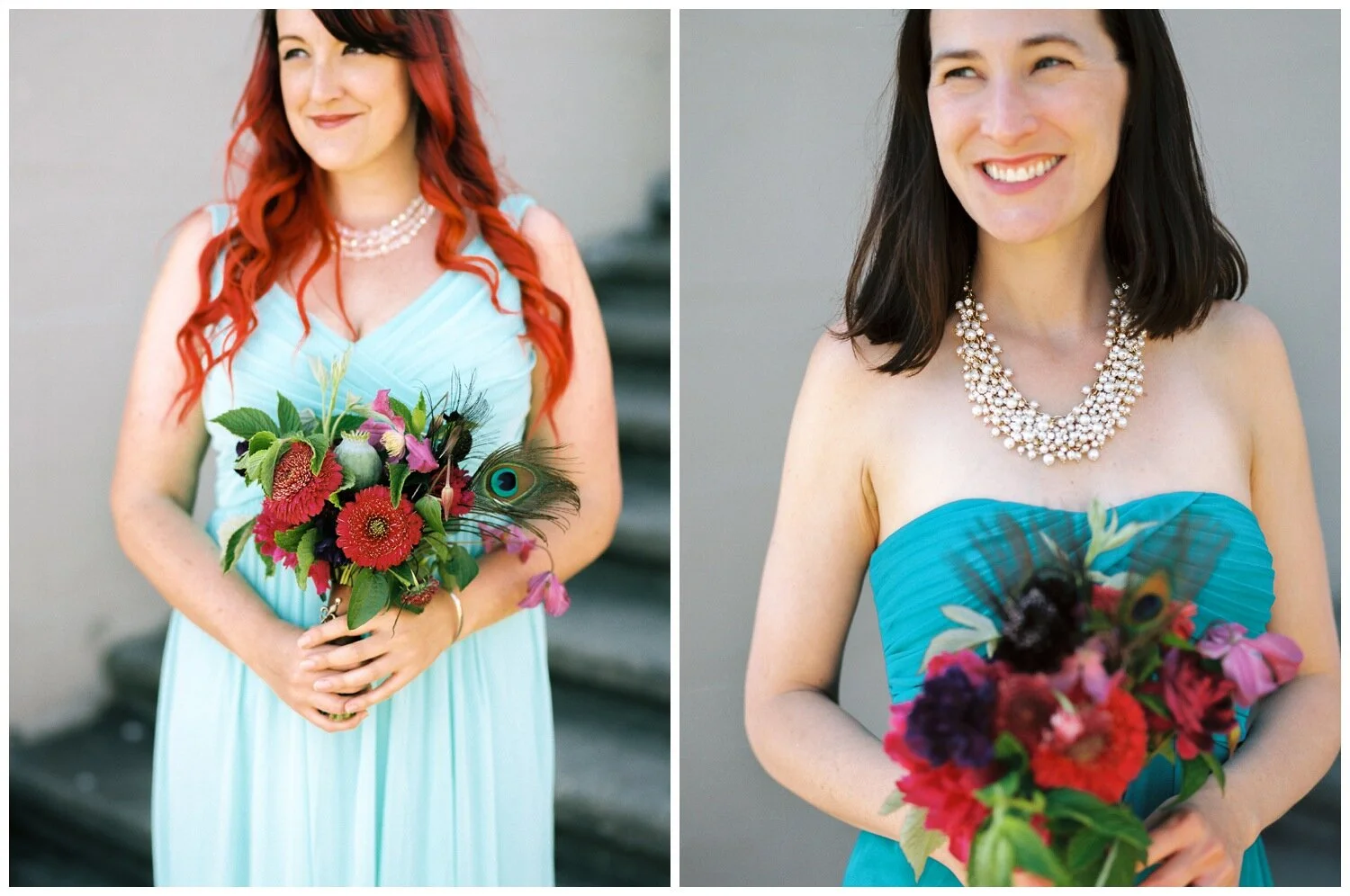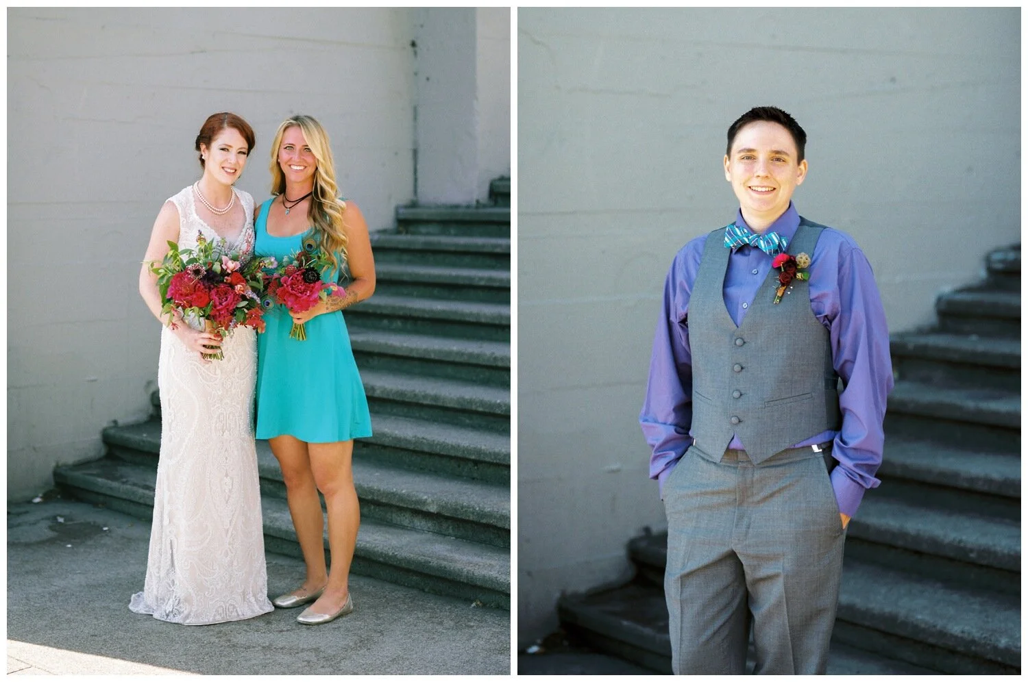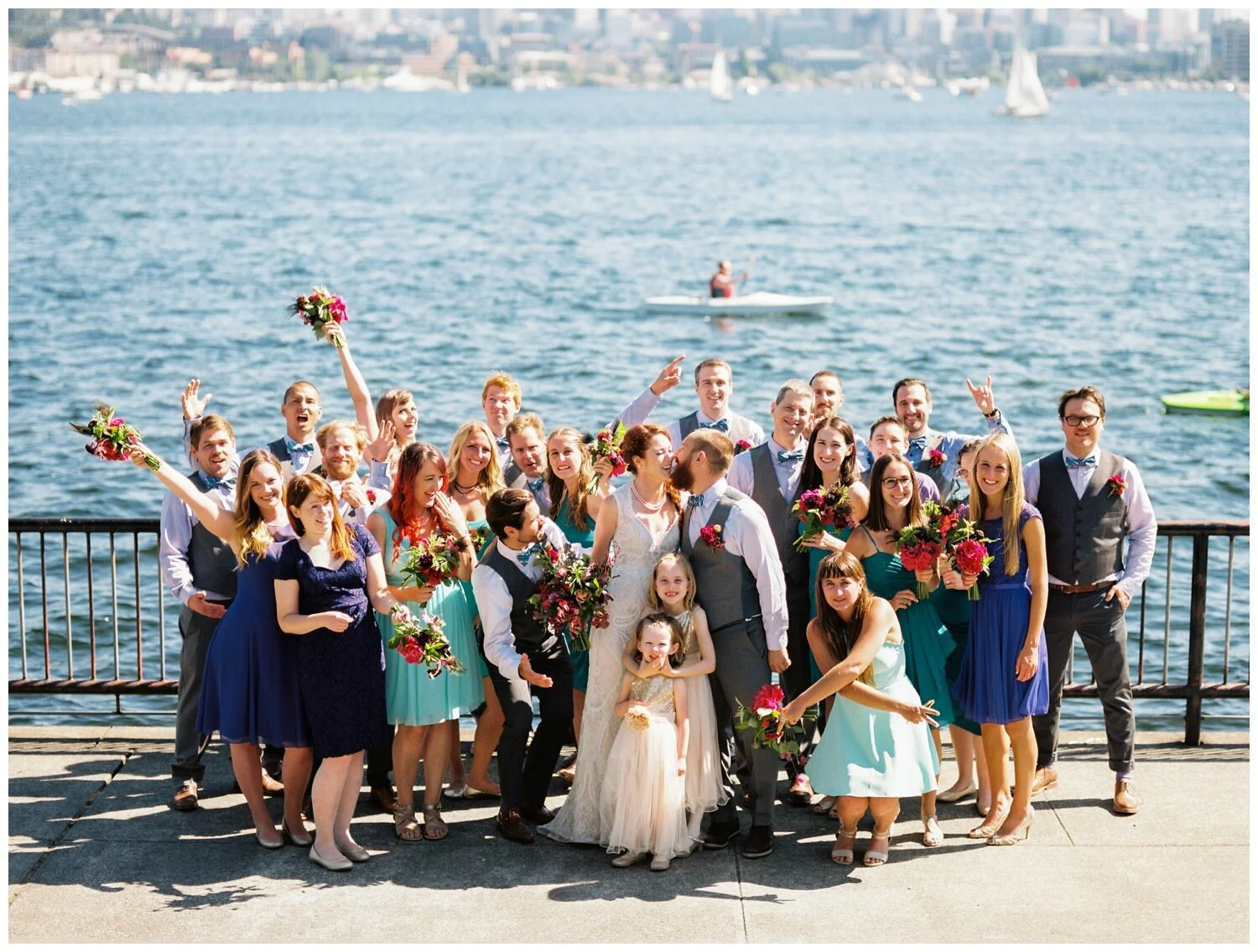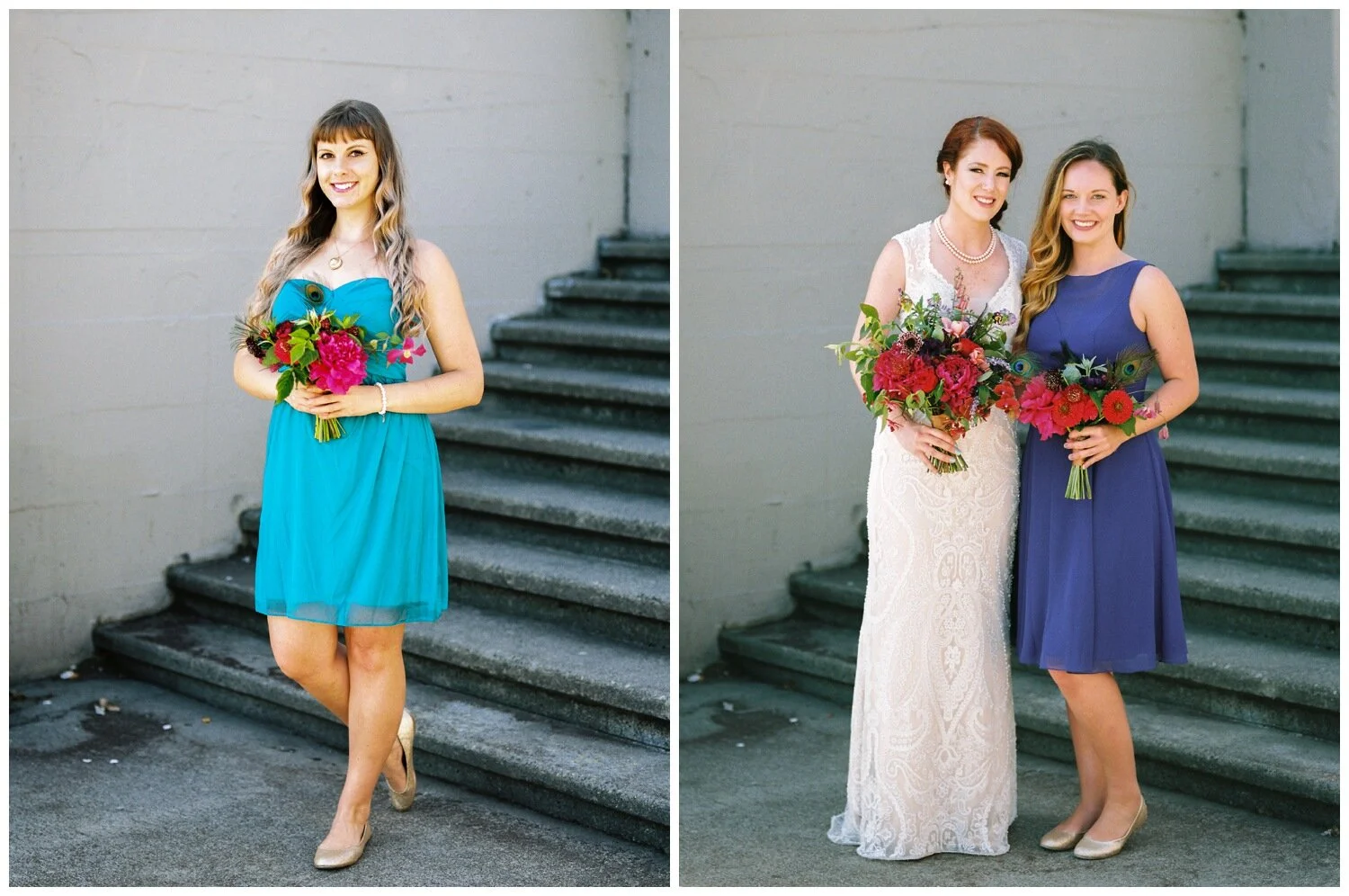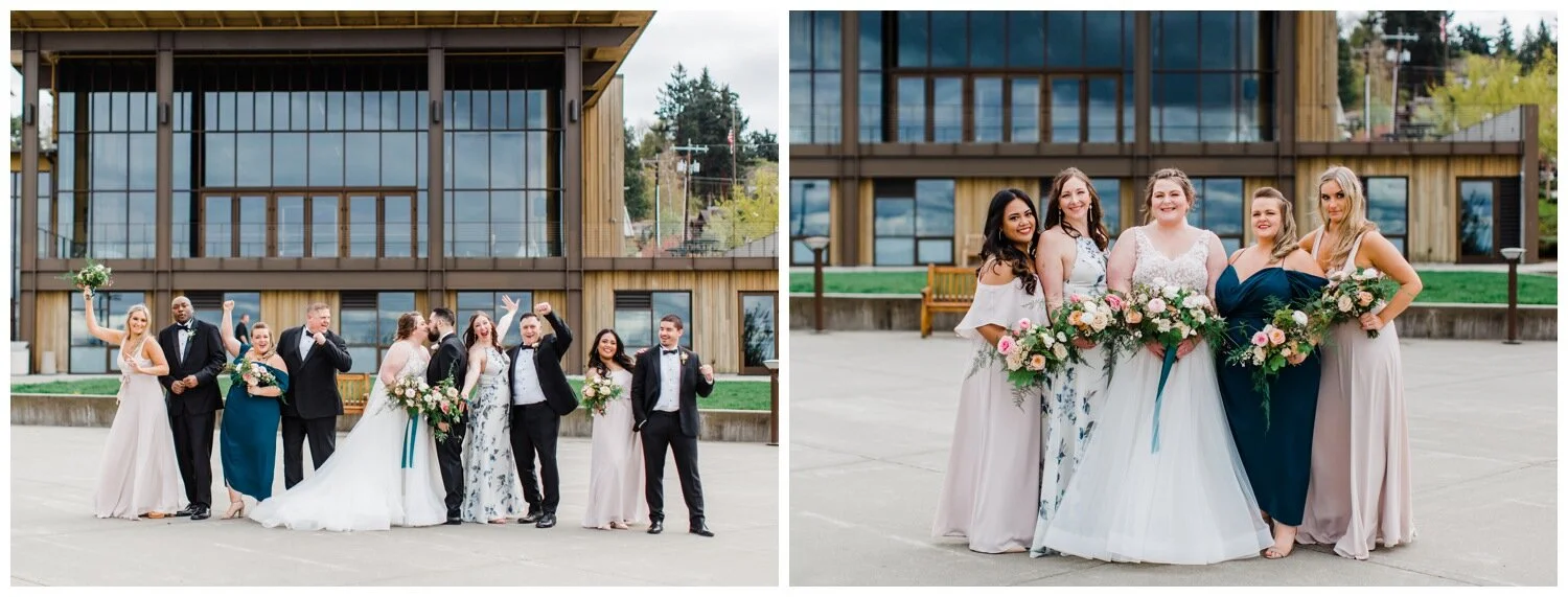 Mardi Gras Inspired Teal and Purple Bridesmaid Dresses at a Seattle Waterfront Wedding
