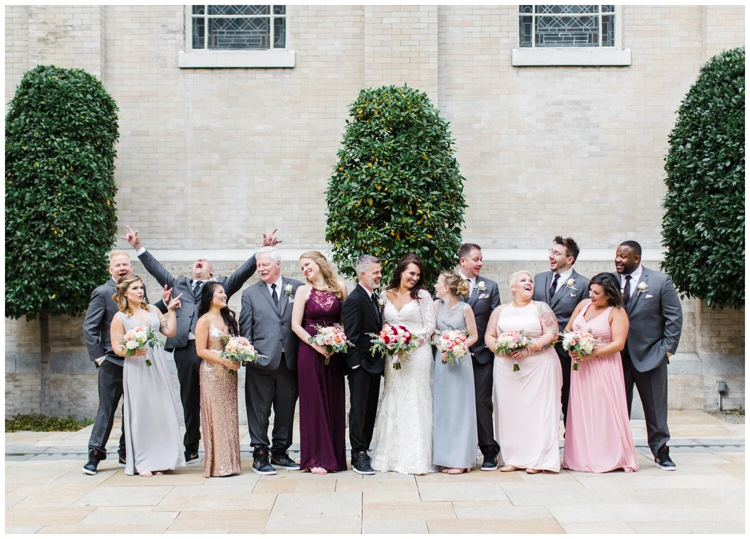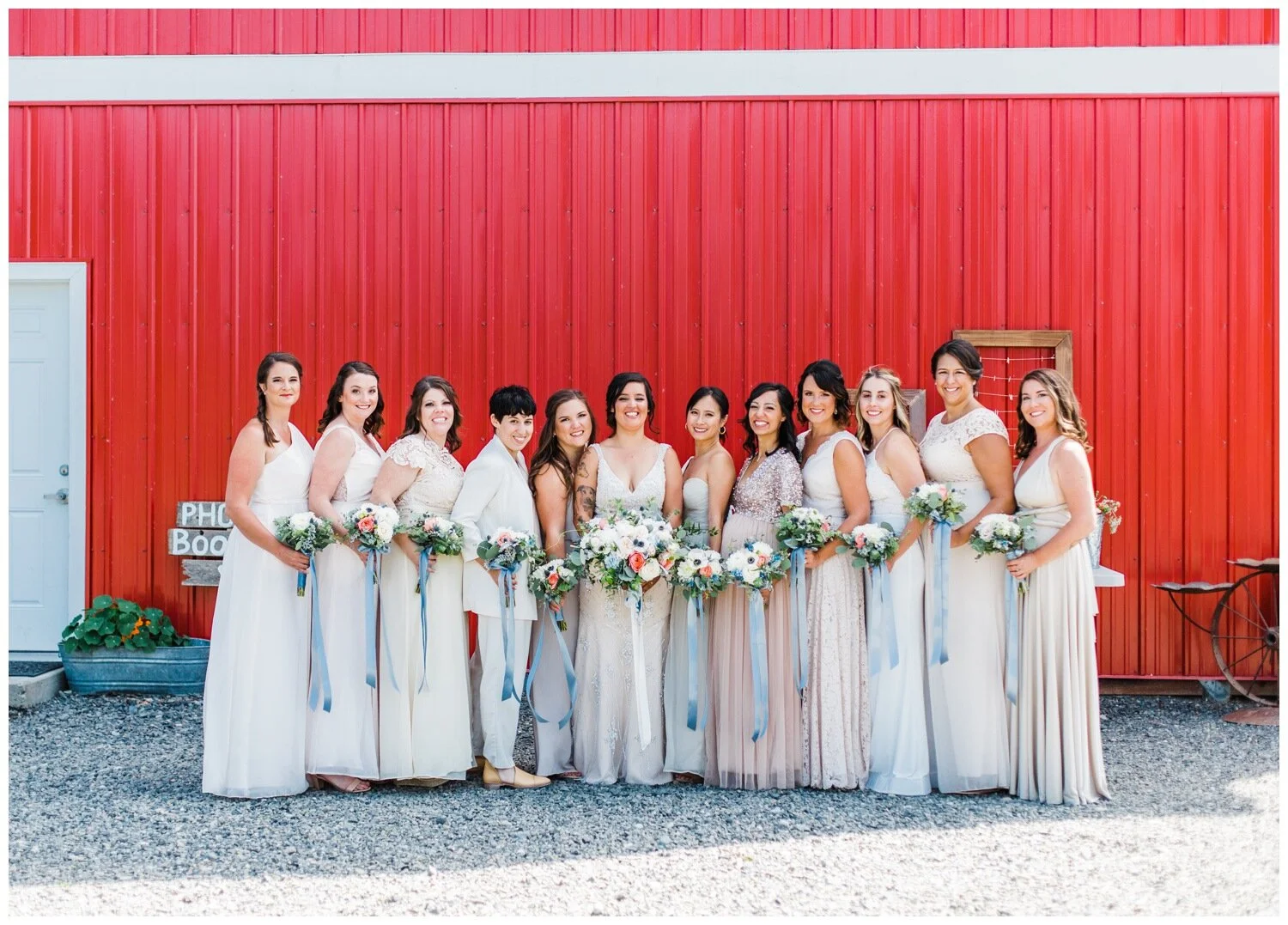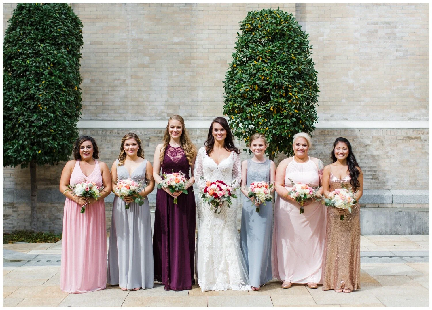 A mixture of bright neutrals always looks stunning and the ladies in Gabi & Trevor’s wedding party look incredible! Don’t you think? Gabi and Trevor also get kudos for having one of the largest wedding parties I’ve ever photographed. The bridesmaids were able to elect for dresses in the dove grey, white and dusty pink family and they look awesome. By giving her bridesmaids some minimal direction – the color family and that she preferred the length of the dresses to be to the ground, these ladies look stylish and coordinated while each being able to embrace their own style preferences. Aiding in this coordinated look is the fact that the bridesmaids have matching bouquets and the light blue ribbons accent the light colors of their dresses. This wedding party also embraced non-dress options, as Gabi’s sister opted for a super polished blazer and coordinated pants as her wedding ensemble. One more detail really giving this wedding party look an extra boost is Gabi’s off-white ivory dress that was absolutely covered in beading and intricate lace work. The texture and detail of her dress stood out beautifully against the fabric choices by the bridesmaids, as they largely opted for plain materials without embellishment.