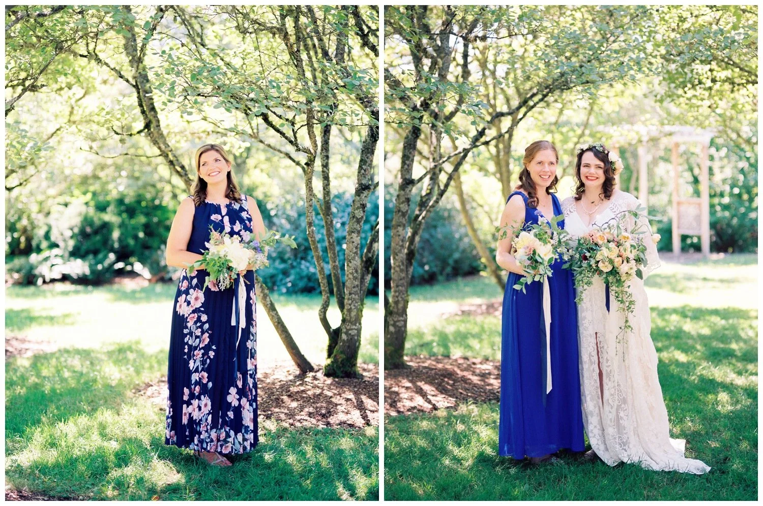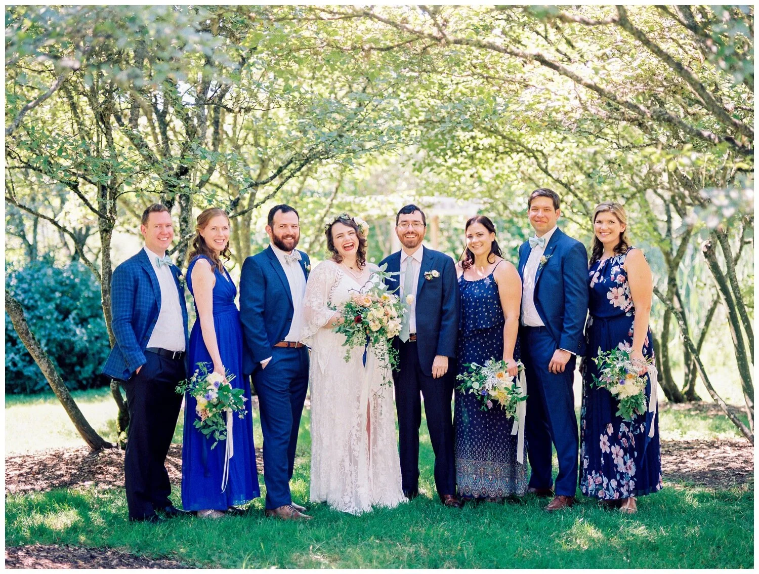 Katharine & Ed’s summertime wedding at the University of Washington Center for Urban Horticulture was a perfect setting to embrace rich navy and royal blue tones to contrast against the gorgeous gardens and whimsical bouquets. My choosing a specific color and encouraging her bridesmaids to go for a print if they wanted, Katharine’s attendants wound up creating a gorgeous and coordinated ensemble despite the fact that their dresses aren’t identical. I especially love the fact that the groomsmen had simialr freedom at this wedding! Using the royal and navy blue direction, the groomsmen were able to wear a suit of their choice, one of them opting for some pattern in his wardrobe as well! When considering your wedding colors and style, keep the venue in mind. Is it outdoors, indoors, light and bright, dark and moody? Choosing a color palette or theme that contrasts against the vibe of your venue is a great way to go and Katharine’s wedding party pulled this off in style.