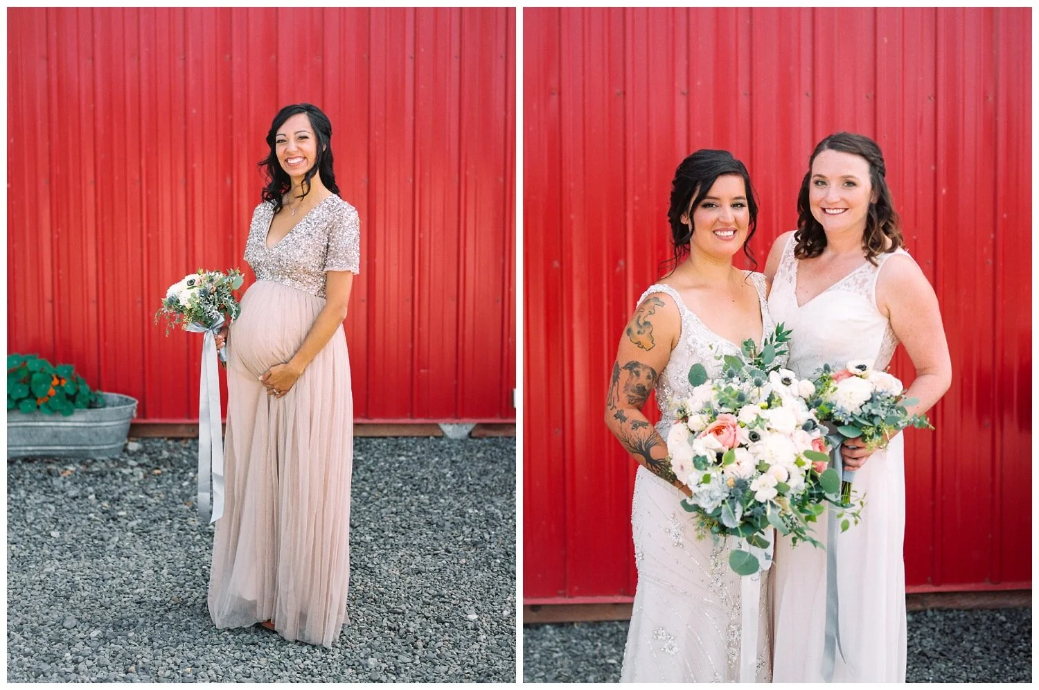 Rachel & Bender’s combination of jewel tones and neutrals makes for a fun, yet formal looking wedding party, which was perfect for their church wedding in Seattle. When putting together a color family for your wedding I suggest minimizing your bold color selection to a single dark or saturated hue, and complimenting options that always work are less saturated or brighter versions of the same color or one right next to it on the color wheel, as well as desaturated neutrals like the grey dresses in Rachel’s wedding party. You can’t go wrong with including metallics when you’re working with jewel tone’s, and Rachel’s bridesmaid who sported a gold sequin dress rounded out the color family chosen for this wedding party.